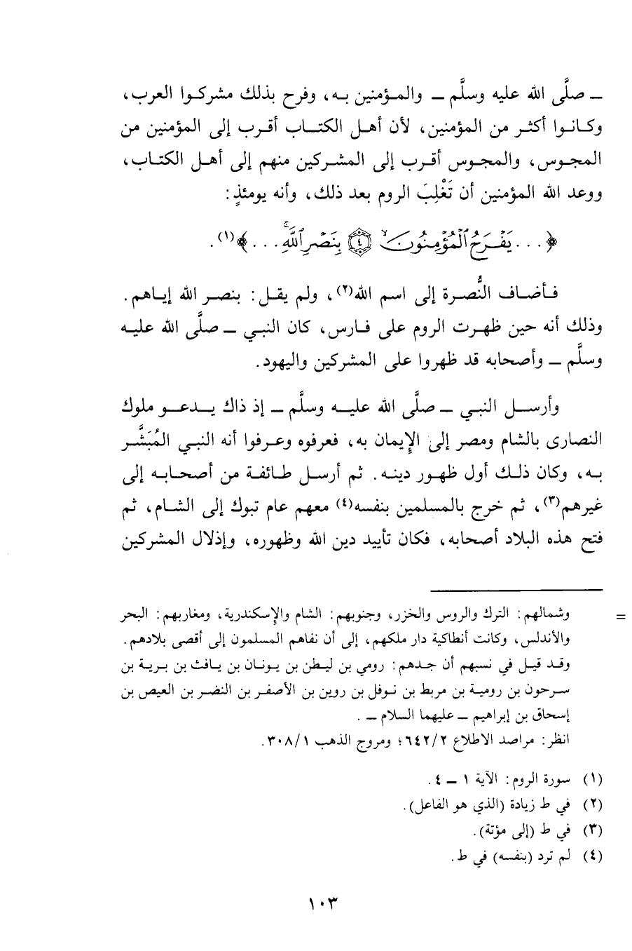 وَأَرْسَلَ النَّبِيُّ - صَلَّى اللَّهُ عَلَيْهِ وَسَلَّمَ - إِذْ ذَاكَ يَدْعُو مُلُوكَ النَّصَارَى بِالشَّامِ وَمِصْرَ إِلَى الْإِيمَانِ بِهِ، فَعَرَفُوهُ وَعَرَفُوا أَنَّهُ النَّبِيُّ الْمُبَشَّرُ بِهِ، وَكَانَ ذَلِكَ أَوَّلَ ظُهُورِ دِينِهِ، ثُمَّ أَرْسَلَ طَائِفَةً مِنْ أَصْحَابِهِ إِلَى غَيْرِهِمْ، ثُمَّ خَرَجَ بِالْمُسْلِمِينَ بِنَفْسِهِ مَعَهُمْ عَامَ تَبُوكَ إِلَى الشَّامِ، ثُمَّ فَتَحَ هَذِهِ الْبِلَادَ أَصْحَابُهُ، فَكَانَ تَأْيِيدُ دِينِ اللَّهِ وَظُهُورُهُ وَإِذْلَالُ الْمُشْرِكِينَ
