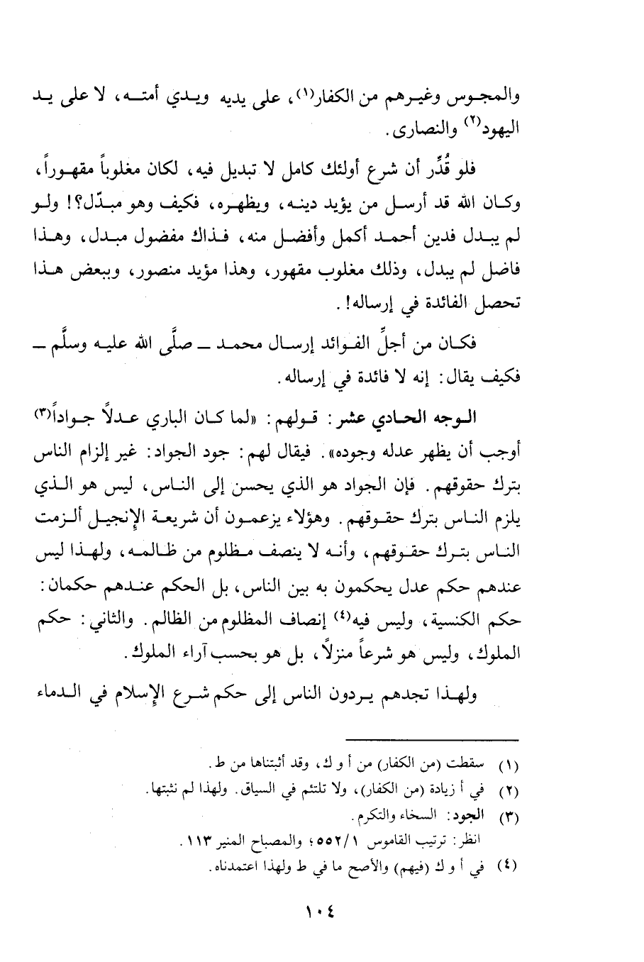 الْوَجْهُ الْحَادِي عَشَرَ: قَوْلُهُمْ: " لَمَّا كَانَ الْبَارِي عَدْلًا جَوَّادًا أَوْجَبَ أَنْ يُظْهِرَ عَدْلَهُ وَجُودَهُ " فَيُقَالُ لَهُمْ: جُودُ الْجَوَّادِ غَيْرُ إِلْزَامِ النَّاسِ بِتَرْكِ حُقُوقِهِمْ، فَإِنَّ الْجَوَّادَ هُوَ الَّذِي يُحْسِنُ إِلَى النَّاسِ لَيْسَ هُوَ الَّذِي يُلْزِمُ النَّاسَ بِتَرْكِ حُقُوقِهِمْ، وَهَؤُلَاءِ يَزْعُمُونَ أَنَّ شَرِيعَةَ الْإِنْجِيلِ أَلْزَمَتِ النَّاسَ بِتَرْكِ حُقُوقِهِمْ، وَأَنَّهُ لَا يُنْصَفُ مَظْلُومٌ مِنْ ظَالِمِهِ، وَلِهَذَا لَيْسَ عِنْدَهُمْ حُكْمٌ عَدْلٌ يَحْكُمُونَ بِهِ بَيْنَ النَّاسِ، بَلِ الْحُكْمُ عِنْدَهُمْ حُكْمَانِ: حُكْمُ الْكَنِيسَةِ، وَلَيْسَ فِيهِ إِنْصَافُ الْمَظْلُومِ مِنَ الظَّالِمِ. وَالثَّانِي: حُكْمُ الْمُلُوكِ، وَلَيْسَ هُوَ شَرْعًا مُنَزَّلًا، بَلْ هُوَ بِحَسْبِ آرَاءِ الْمُلُوكِ.