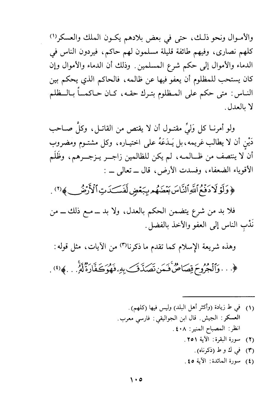 فَلَا بُدَّ مِنْ شَرْعٍ يَتَضَمَّنُ الْحُكْمَ بِالْعَدْلِ وَلَا بُدَّ - مَعَ ذَلِكَ - مِنْ نَدْبِ النَّاسِ إِلَى الْعَفْوِ وَالْأَخْذِ بِالْفَضْلِ.