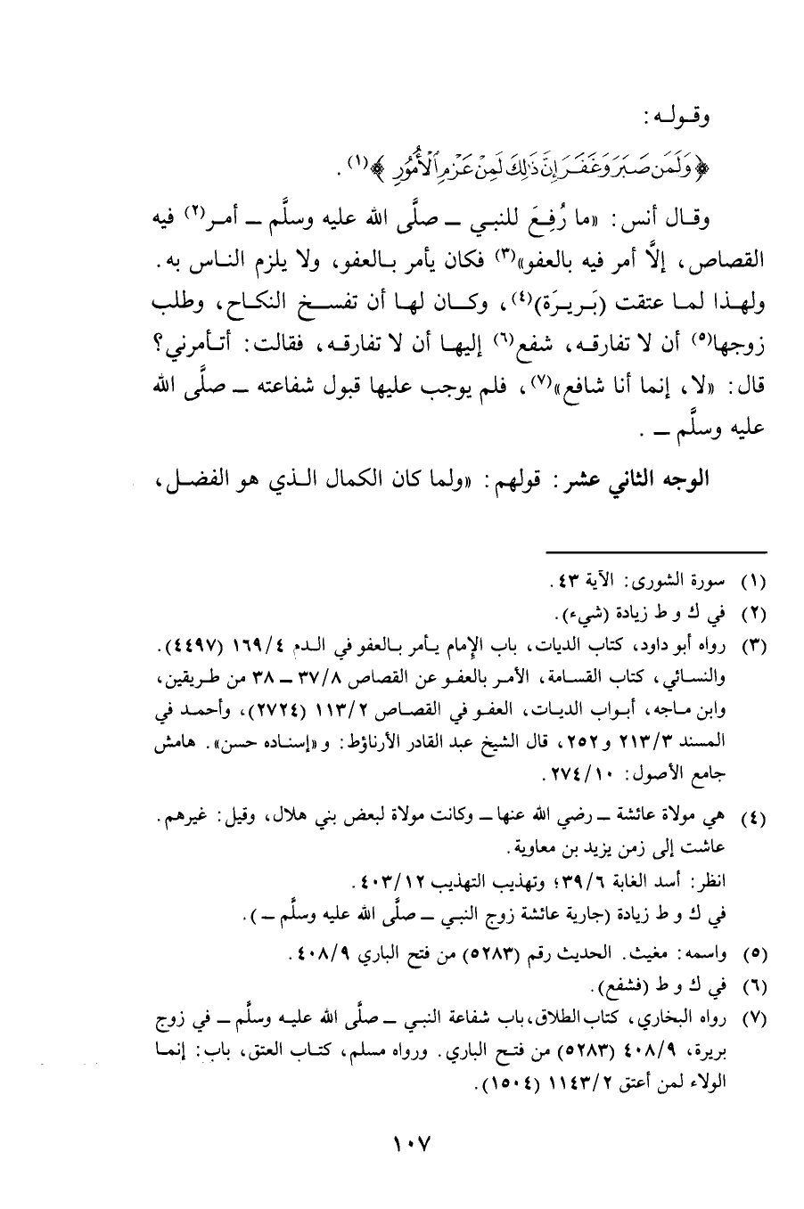 وَقَالَ أَنَسٌ: " «مَا رُفِعَ لِلنَّبِيِّ - صَلَّى اللَّهُ عَلَيْهِ وَسَلَّمَ - أَمْرٌ فِيهِ الْقِصَاصُ، إِلَّا أَمَرَ فِيهِ بِالْعَفْوِ» " فَكَانَ يَأْمُرُ بِالْعَفْوِ، وَلَا يُلْزِمُ النَّاسَ بِهِ؛ وَلِهَذَا لَمَّا عَتَقَتْ (بَرِيرَةُ) ، وَكَانَ لَهَا أَنْ تَفْسَخَ النِّكَاحَ، وَطَلَبَ زَوْجُهَا أَنْ لَا تُفَارِقَهُ، شَفَعَ إِلَيْهَا أَنْ لَا تُفَارِقَهُ، فَقَالَتْ: أَتَأْمُرُنِي؟ قَالَ: لَا إِنَّمَا أَنَا شَافِعٌ فَلَمْ يُوجِبْ عَلَيْهَا قَبُولَ شَفَاعَتِهِ - صَلَّى اللَّهُ عَلَيْهِ وَسَلَّمَ -.