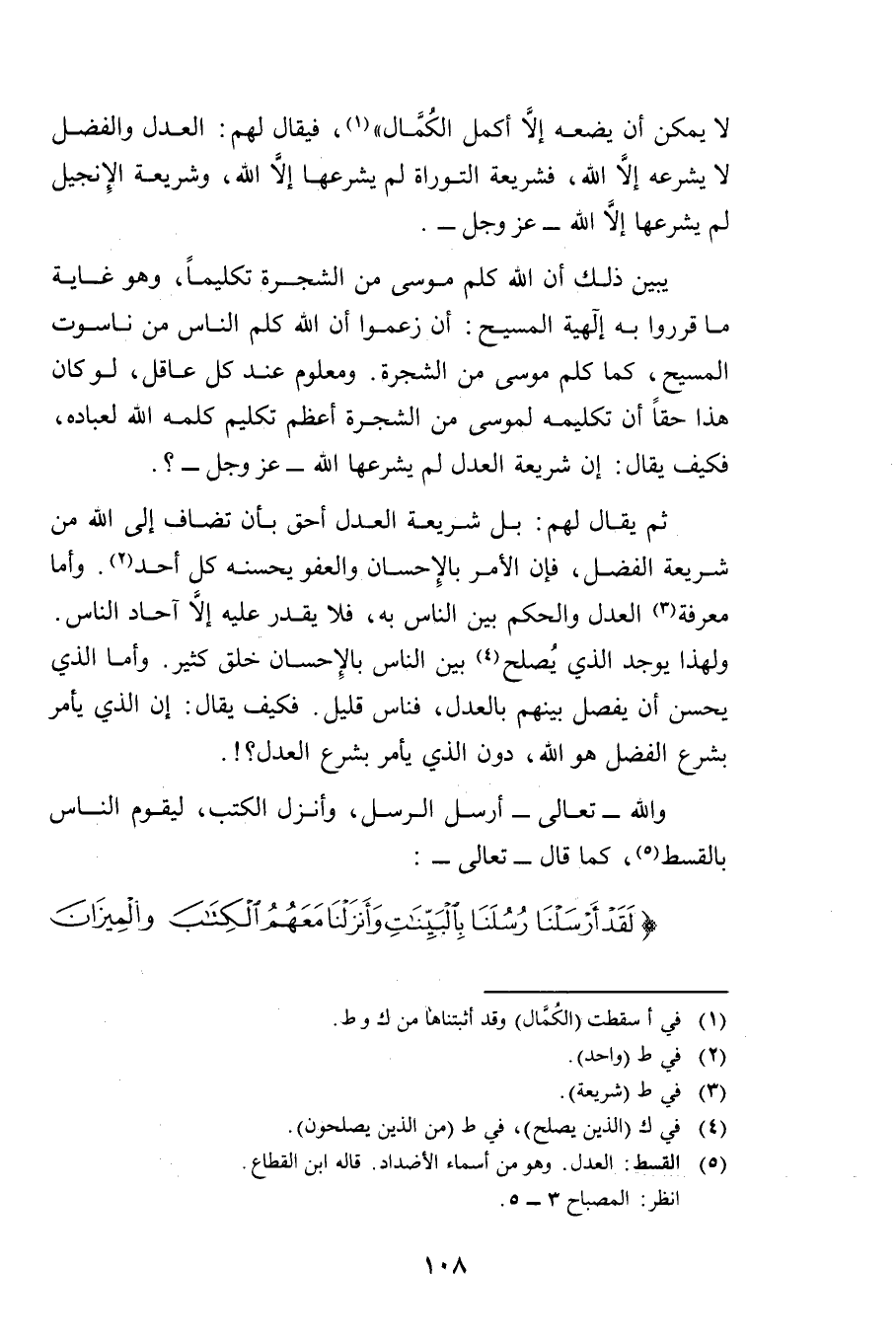 يُبَيِّنُ ذَلِكَ أَنَّ اللَّهَ كَلَّمَ مُوسَى مِنَ الشَّجَرَةِ تَكْلِيمًا، وَهُمْ غَايَةُ مَا قَرَّرُوا بِهِ إِلَهِيَّةَ الْمَسِيحِ أَنْ زَعَمُوا أَنَّ اللَّهَ كَلَّمَ النَّاسَ مِنْ نَاسُوتِ الْمَسِيحِ، كَمَا كَلَّمَ مُوسَى مِنَ الشَّجَرَةِ، وَمَعْلُومٌ عِنْدَ كُلِّ عَاقِلٍ، لَوْ كَانَ هَذَا حَقًّا، أَنَّ تَكْلِيمَهُ لِمُوسَى مِنَ الشَّجَرَةِ أَعْظَمُ تَكْلِيمٍ كَلَّمَهُ اللَّهُ لِعِبَادِهِ فَكَيْفَ يُقَالُ: إِنَّ شَرِيعَةَ الْعَدْلِ لَمْ يُشَرِّعْهَا اللَّهُ عَزَّ وَجَلَّ؟ .