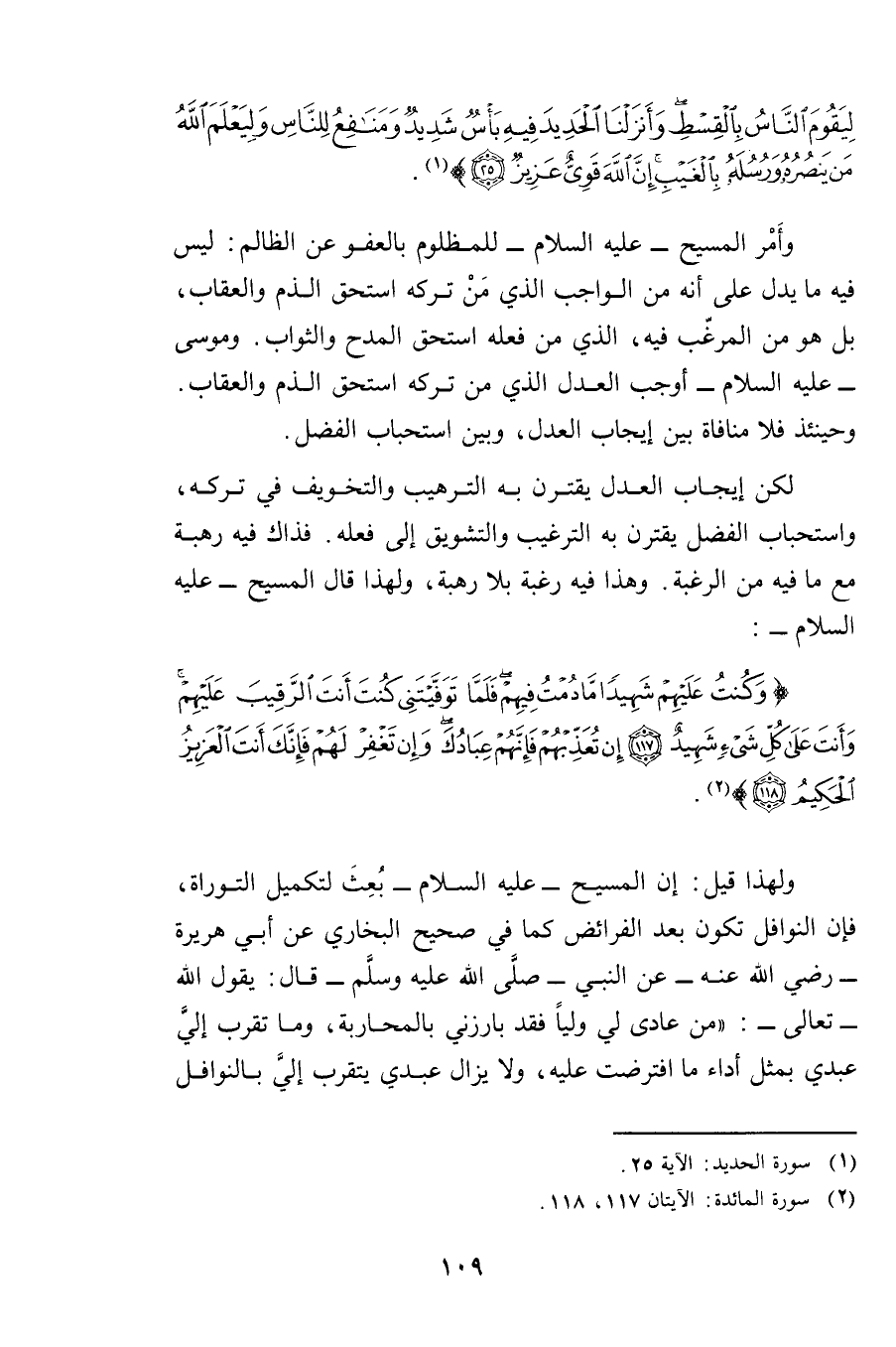 وَأَمْرُ الْمَسِيحِ - عَلَيْهِ السَّلَامُ - لِلْمَظْلُومِ بِالْعَفْوِ عَنِ الظَّالِمِ: لَيْسَ فِيهِ مَا يَدُلُّ عَلَى أَنَّهُ مِنَ الْوَاجِبِ الَّذِي مَنْ تَرَكَهُ اسْتَحَقَّ الذَّمَّ وَالْعِقَابَ، بَلْ هُوَ مِنَ الْمُرَغَّبِ فِيهِ الَّذِي مَنْ فَعَلَهُ اسْتَحَقَّ الْمَدْحَ وَالثَّوَابَ. وَمُوسَى - عَلَيْهِ السَّلَامُ - أَوْجَبَ الْعَدْلَ الَّذِي مَنْ تَرَكَهُ اسْتَحَقَّ الذَّمَّ وَالْعِقَابَ. وَحِينَئِذٍ فَلَا مُنَافَاةَ بَيْنَ إِيجَابِ الْعَدْلِ، وَبَيْنَ اسْتِحْبَابِ الْفَضْلِ.