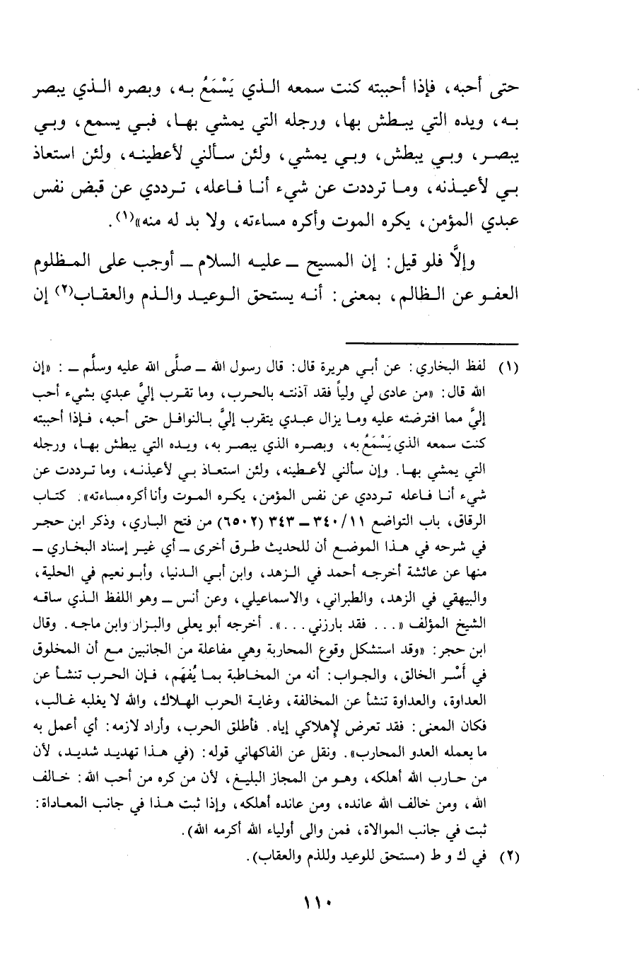 حَتَّى أُحِبَّهُ، فَإِذَا أَحْبَبْتُهُ كُنْتُ سَمْعَهُ الَّذِي يَسْمَعُ بِهِ، وَبَصَرَهُ الَّذِي يُبْصِرُ بِهِ، وَيَدَهُ الَّتِي يَبْطِشُ بِهَا، وَرِجْلَهُ الَّتِي يَمْشِي بِهَا، فَبِي يَسْمَعُ وَبِي يُبْصِرُ وَبِي يَبْطِشُ وَبِي يَمْشِي، وَلَئِنْ سَأَلَنِي لَأُعْطِيَنَّهُ وَلَئِنِ اسْتَعَاذَ بِي لَأُعِيذَنَّهُ، وَمَا تَرَدَّدْتُ عَنْ شَيْءٍ أَنَا فَاعِلُهُ تَرَدُّدِي عَنْ قَبْضِ نَفْسِ عَبْدِي الْمُؤْمِنِ، يَكْرَهُ الْمَوْتَ وَأَكْرَهُ مَسَاءَتَهُ، وَلَا بُدَّ لَهُ مِنْهُ» .