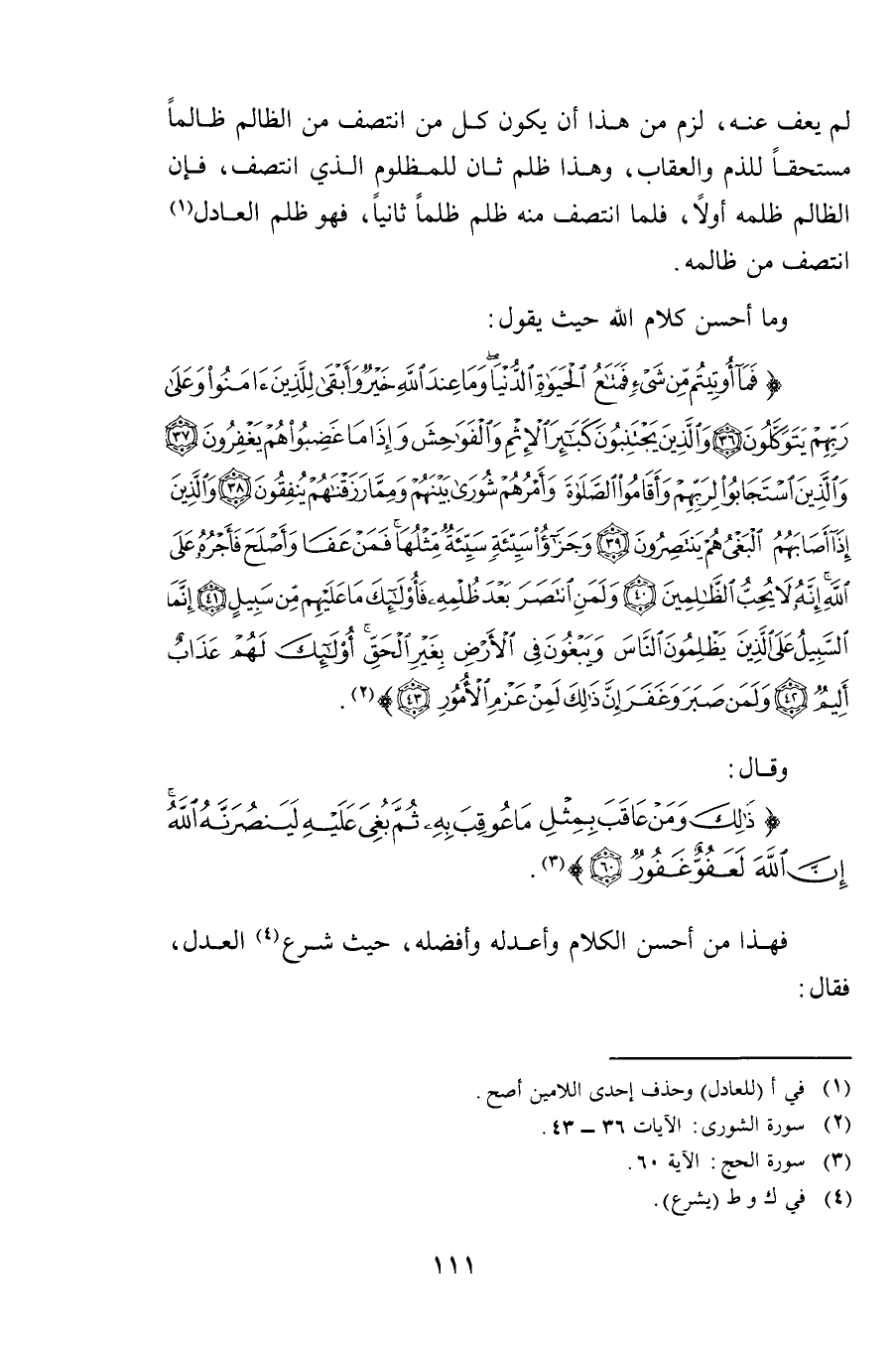 فَهَذَا مِنْ أَحْسَنِ الْكَلَامِ وَأَعْدَلِهِ وَأَفْضَلِهِ حَيْثُ شَرَعَ الْعَدْلَ فَقَالَ: