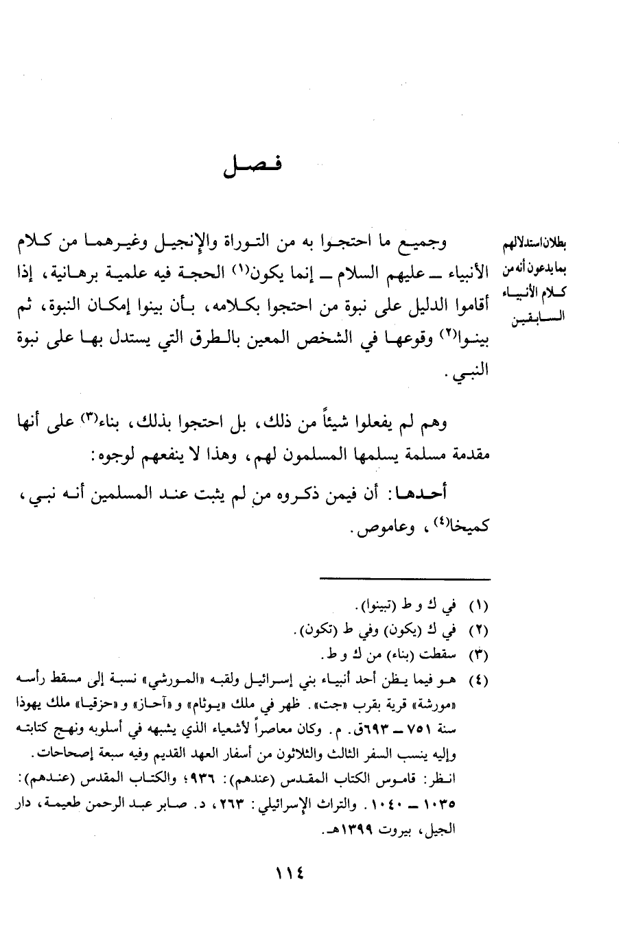 وَجَمِيعُ مَا احْتَجُّوا بِهِ مِنَ التَّوْرَاةِ وَالْإِنْجِيلِ وَغَيْرِهِمَا مِنْ كَلَامِ الْأَنْبِيَاءِ - عَلَيْهِمُ السَّلَامُ - إِنَّمَا يَكُونُ الْحُجَّةُ فِيهِ عِلْمِيَّةً بُرْهَانِيَّةً، إِذَا أَقَامُوا الدَّلِيلَ عَلَى نُبُوَّةِ مَنِ احْتَجُّوا بِكَلَامِهِ، بِأَنْ بَيَّنُوا إِمْكَانَ النُّبُوَّةِ ثُمَّ بَيَّنُوا وُقُوعَهَا فِي الشَّخْصِ الْمُعَيَّنِ بِالطُّرُقِ الَّتِي يُسْتَدَلُّ بِهَا عَلَى نُبُوَّةِ النَّبِيِّ.