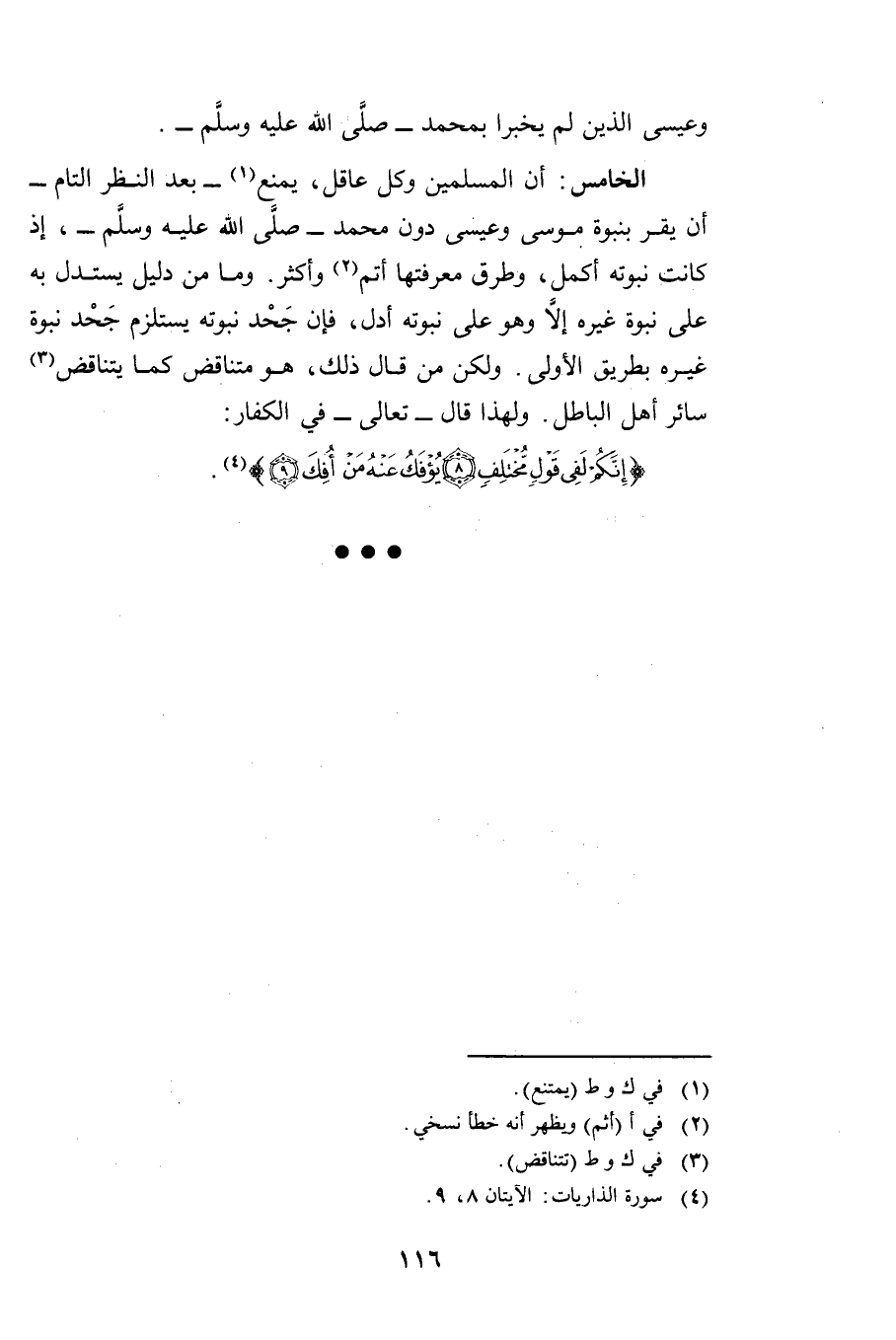 الْخَامِسُ: أَنَّ الْمُسْلِمِينَ وَكُلَّ عَاقِلٍ، يَمْنَعُ - بَعْدَ النَّظَرِ التَّامِّ - أَنْ يُقِرَّ بِنُبُوَّةِ مُوسَى وَعِيسَى دُونَ مُحَمَّدٍ - صَلَّى اللَّهُ عَلَيْهِ وَسَلَّمَ -، إِذْ كَانَتْ نُبُوَّتُهُ أَكْمَلَ، وَطُرُقُ مَعْرِفَتِهَا أَتَمَّ وَأَكْثَرَ وَمَا مِنْ دَلِيلٍ يُسْتَدَلُّ بِهِ عَلَى نُبُوَّةِ غَيْرِهِ إِلَّا وَهُوَ عَلَى نُبُوَّتِهِ أَدَلُّ، فَإِنَّ جَحْدَ نُبُوَّتِهِ يَسْتَلْزِمُ جَحْدَ نُبُوَّةِ غَيْرِهِ بِطَرِيقِ الْأَوْلَى. وَلَكِنَّ مَنْ قَالَ ذَلِكَ هُوَ مُتَنَاقِضٌ كَمَا يَتَنَاقَضُ سَائِرُ أَهْلِ الْبَاطِلِ؛ وَلِهَذَا قَالَ - تَعَالَى - فِي الْكُفَّارِ: