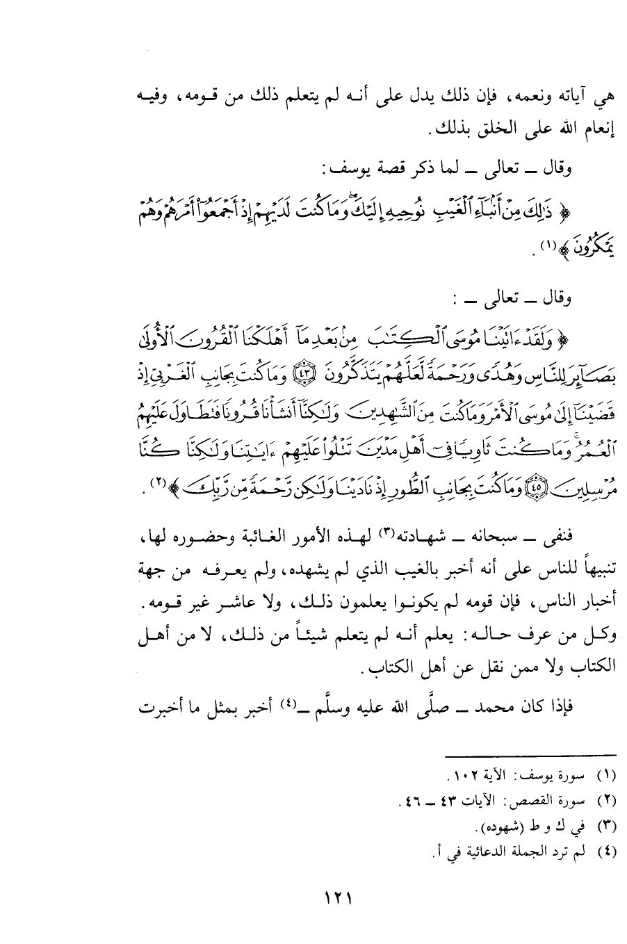 {وَلَقَدْ آتَيْنَا مُوسَى الْكِتَابَ مِنْ بَعْدِ مَا أَهْلَكْنَا الْقُرُونَ الْأُولَى بَصَائِرَ لِلنَّاسِ وَهُدًى وَرَحْمَةً لَعَلَّهُمْ يَتَذَكَّرُونَ - وَمَا كُنْتَ بِجَانِبِ الْغَرْبِيِّ إِذْ قَضَيْنَا إِلَى مُوسَى الْأَمْرَ وَمَا كُنْتَ مِنَ الشَّاهِدِينَ - وَلَكِنَّا أَنْشَأْنَا قُرُونًا فَتَطَاوَلَ عَلَيْهِمُ الْعُمُرُ وَمَا كُنْتَ ثَاوِيًا فِي أَهْلِ مَدْيَنَ تَتْلُو عَلَيْهِمْ آيَاتِنَا وَلَكِنَّا كُنَّا مُرْسِلِينَ - وَمَا كُنْتَ بِجَانِبِ الطُّورِ إِذْ نَادَيْنَا وَلَكِنْ رَحْمَةً مِنْ رَبِّكَ} [القصص: 43 - 46] .