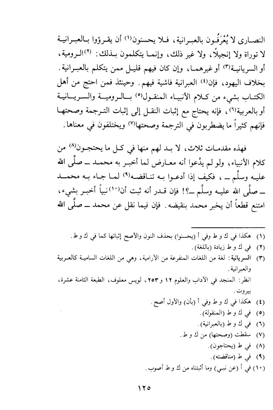 النَّصَارَى لَا يُعْرَفُونَ بِالْعِبْرَانِيَّةِ، فَلَا يُحْسِنُونَ أَنْ يَقْرَءُوا بِالْعِبْرَانِيَّةِ لَا تَوْرَاةَ وَلَا إِنْجِيلًا وَلَا غَيْرَ ذَلِكَ، وَإِنَّمَا يَتَكَلَّمُونَ بِذَلِكَ: الرُّومِيَّةَ أَوِ السُّرْيَانِيَّةَ أَوْ غَيْرَهُمَا، وَإِنْ كَانَ فِيهِمْ قَلِيلٌ مِمَّنْ يَتَكَلَّمُ بِالْعِبْرَانِيَّةِ، بِخِلَافِ الْيَهُودِ، فَإِنَّ الْعِبْرَانِيَّةَ فَاشِيَّةٌ فِيهِمْ، وَحِينَئِذٍ فَمَنِ احْتَجَّ مِنْ أَهْلِ الْكِتَابِ بِشَيْءٍ مِنْ كَلَامِ الْأَنْبِيَاءِ الْمَنْقُولِ بِالرُّومِيَّةِ وَالسُّرْيَانِيَّةِ أَوْ بِالْعَرَبِيَّةِ، فَإِنَّهُ يَحْتَاجُ مَعَ إِثْبَاتِ النَّقْلِ إِلَى إِثْبَاتِ التَّرْجَمَةِ وَصِحَّتِهَا؛ فَإِنَّهُمْ كَثِيرًا مَا يَضْطَرِبُونَ فِي التَّرْجَمَةِ وَصِحَّتِهَا وَيَخْتَلِفُونَ فِي مَعْنَاهَا.