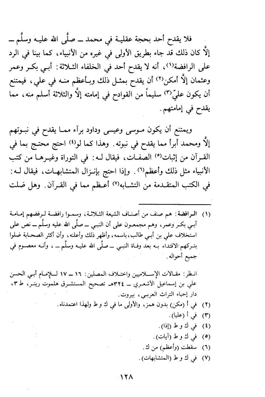 وَيَمْتَنِعُ أَنْ يَكُونَ مُوسَى وَعِيسَى وَدَاوُدُ بَرَآءً مِمَّا يَقْدَحُ فِي نُبُوَّتِهِمْ إِلَّا وَمُحَمَّدٌ أَبْرَأُ مِمَّا يَقْدَحُ فِي نُبُوَّتِهِ. وَهَذَا كَمَا لَوِ احْتَجَّ مُحْتَجٌّ بِمَا فِي الْقُرْآنِ مِنْ إِثْبَاتِ الصِّفَاتِ، فَيُقَالُ لَهُ: فِي التَّوْرَاةِ وَغَيْرِهَا مِنْ كُتُبِ الْأَنْبِيَاءِ مِثْلُ ذَلِكَ وَأَعْظَمُ، وَإِذَا احْتَجَّ بِإِنْزَالِ الْمُتَشَابِهَاتِ فَيُقَالُ لَهُ: فِي الْكُتُبِ الْمُتَقَدِّمَةِ مِنَ التَّشَابُهِ أَعْظَمُ مِمَّا فِي الْقُرْآنِ. وَهَلْ ضَلَّتِ
