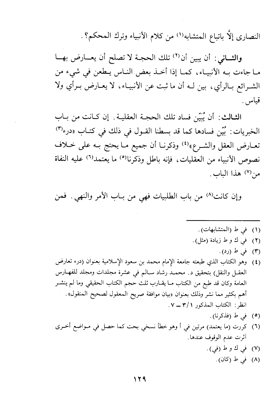 الثَّالِثُ: أَنْ يُبَيَّنَ فَسَادُ تِلْكَ الْحُجَّةِ الْعَقْلِيَّةِ. إِنْ كَانَتْ مِنْ بَابِ الْخَبَرِيَّاتِ: بُيِّنَ فَسَادُهَا كَمَا قَدْ بَسَطْنَا الْقَوْلَ فِي ذَلِكَ فِي كِتَابِ " دَرْءِ تَعَارُضِ الْعَقْلِ وَالشَّرْعِ " وَذَكَرْنَا أَنَّ جَمِيعَ مَا يُحْتَجُّ بِهِ عَلَى خِلَافِ نُصُوصِ الْأَنْبِيَاءِ مِنَ الْعَقْلِيَّاتِ، فَإِنَّهُ بَاطِلٌ. وَذَكَرْنَا مَا يَعْتَمِدُ عَلَيْهِ النُّفَاةُ مِنْ هَذَا الْبَابِ.