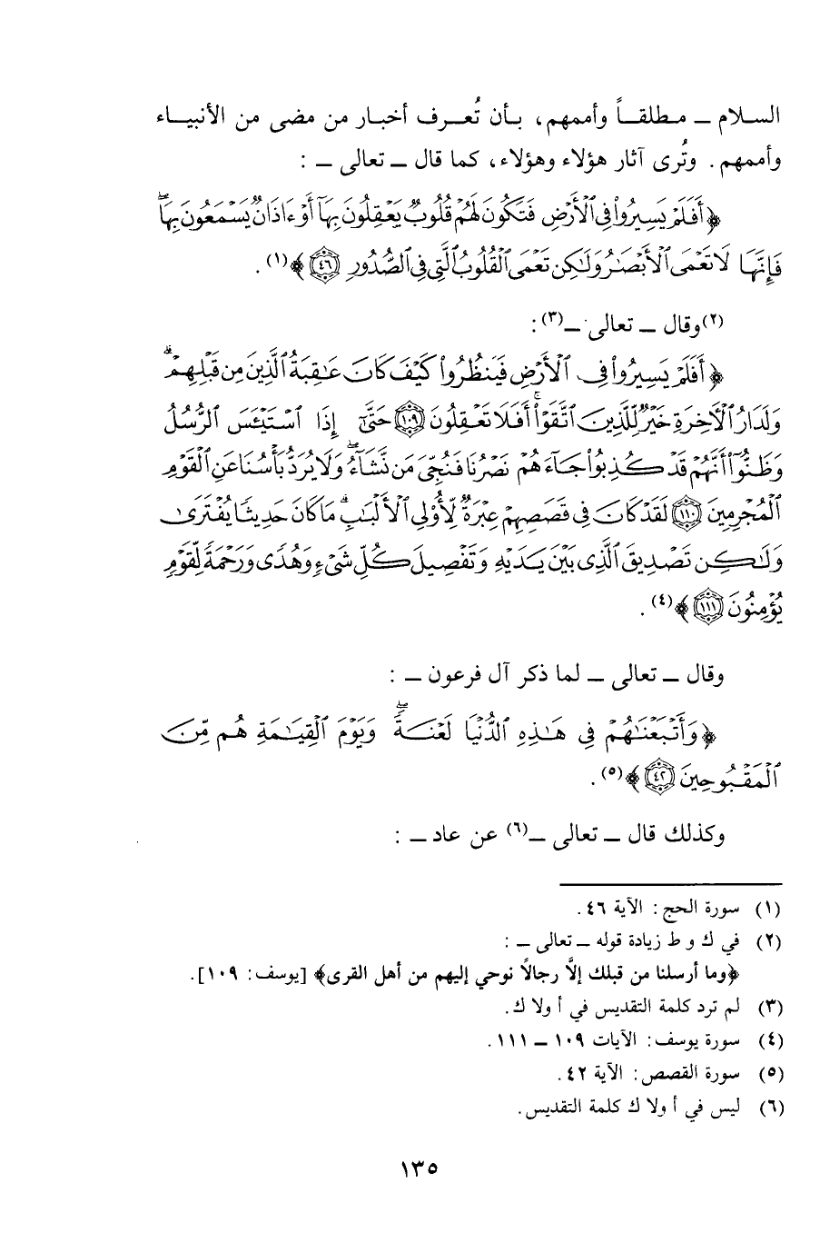 السَّلَامُ - مُطْلَقًا وَأُمَمِهِمْ، بِأَنْ تُعْرَفَ أَخْبَارُ مَنْ مَضَى مِنَ الْأَنْبِيَاءِ وَأُمَمِهِمْ. وَتُرَى آثَارُ هَؤُلَاءِ وَهَؤُلَاءِ كَمَا قَالَ تَعَالَى: