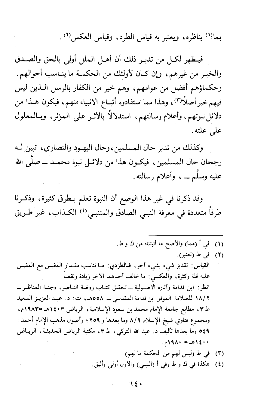 وَكَذَلِكَ مَنْ تَدَبَّرَ حَالَ الْمُسْلِمِينَ، وَحَالَ الْيَهُودِ وَالنَّصَارَى، تَبَيَّنَ لَهُ رُجْحَانُ حَالِ الْمُسْلِمِينَ فَيَكُونُ هَذَا مِنْ دَلَائِلِ نُبُوَّةِ مُحَمَّدٍ - صَلَّى اللَّهُ عَلَيْهِ وَسَلَّمَ - وَأَعْلَامِ رِسَالَتِهِ.