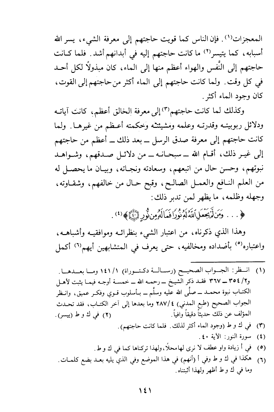 الْمُعْجِزَاتِ. فَإِنَّ النَّاسَ كُلَّمَا قَوِيَتْ حَاجَتُهُمْ إِلَى مَعْرِفَةِ الشَّيْءِ يَسَّرَ اللَّهُ أَسْبَابَهُ كَمَا يَتَيَسَّرُ مَا كَانَتْ حَاجَتُهُمْ إِلَيْهِ فِي أَبْدَانِهِمْ أَشَدَّ.، فَلَمَّا كَانَتْ حَاجَتُهُمْ إِلَى النَّفَسِ وَالْهَوَاءِ أَعْظَمَ مِنْهَا إِلَى الْمَاءِ، كَانَ مَبْذُولًا لِكُلِّ أَحَدٍ فِي كُلِّ وَقْتٍ، وَلَمَّا كَانَتْ حَاجَتُهُمْ إِلَى الْمَاءِ أَكْثَرَ مِنْ حَاجَتِهِمْ إِلَى الْقُوتِ، كَانَ وُجُودُ الْمَاءِ أَكْثَرَ.