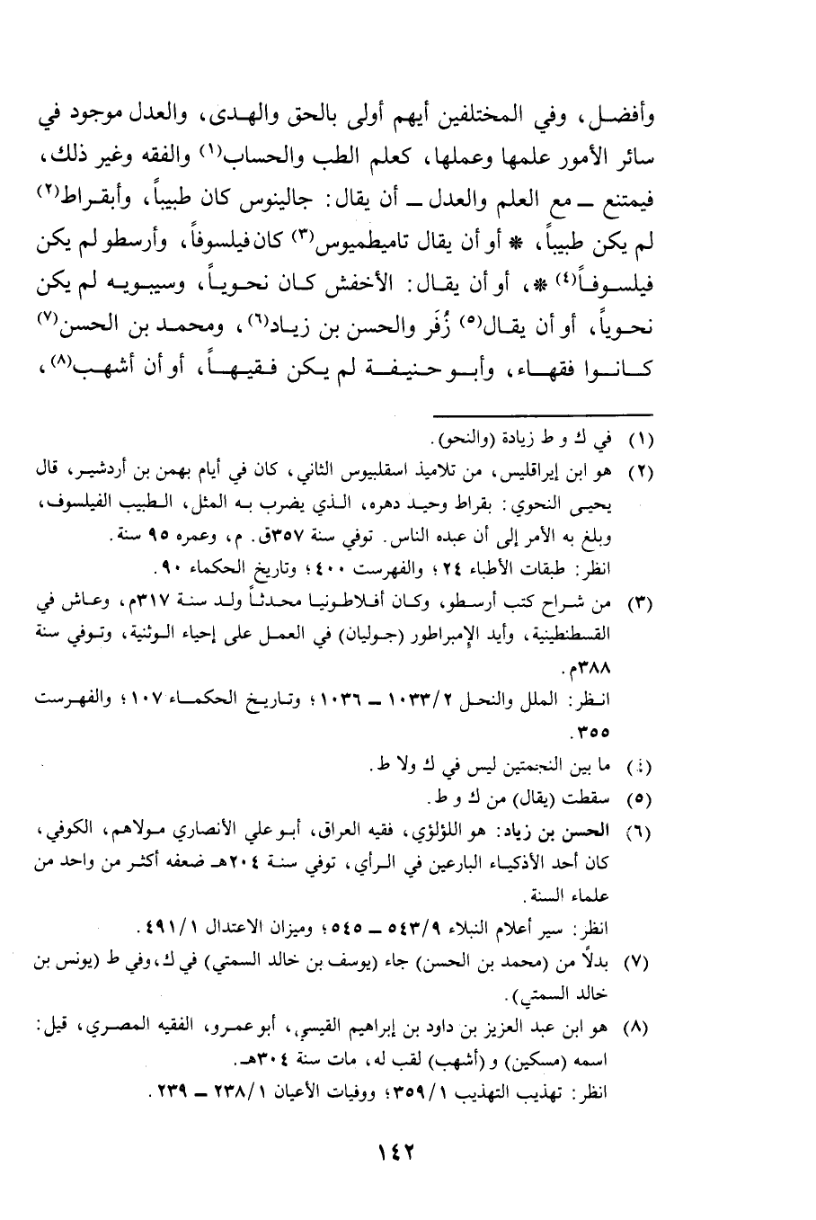 وَأَفْضَلُ، وَفِي الْمُخْتَلِفِينَ أَيُّهُمْ أَوْلَى بِالْحَقِّ وَالْهُدَى، وَالْعَدْلُ مَوْجُودٌ فِي سَائِرِ الْأُمُورِ عِلْمِهَا وَعَمَلِهَا، كَعِلْمِ الطِّبِّ وَالْحِسَابِ وَالْفِقْهِ وَغَيْرِ ذَلِكَ، فَيَمْتَنِعُ - مَعَ الْعِلْمِ وَالْعَدْلِ - أَنْ يُقَالَ: جَالِينُوسُ كَانَ طَبِيبًا، وَأَبُقْرَاطُ لَمْ يَكُنْ طَبِيبًا، أَوْ أَنْ يُقَالَ: تَامِيطُمْيُوسُ كَانَ فَيْلَسُوفًا، وَأَرِسْطُو لَمْ يَكُنْ فَيْلَسُوفًا، أَوْ أَنْ يُقَالَ: الْأَخْفَشُ كَانَ نَحْوِيًّا وَسِيبَوَيْهِ لَمْ يَكُنْ نَحْوِيًّا، أَوْ أَنْ يُقَالَ: زُفَرُ وَالْحَسَنُ بْنُ زِيَادٍ وَمُحَمَّدُ بْنُ الْحَسَنِ كَانُوا فُقَهَاءَ، وَأَبُو حَنِيفَةَ لَمْ يَكُنْ فَقِيهًا، أَوْ أَنَّ أَشْهَبَ