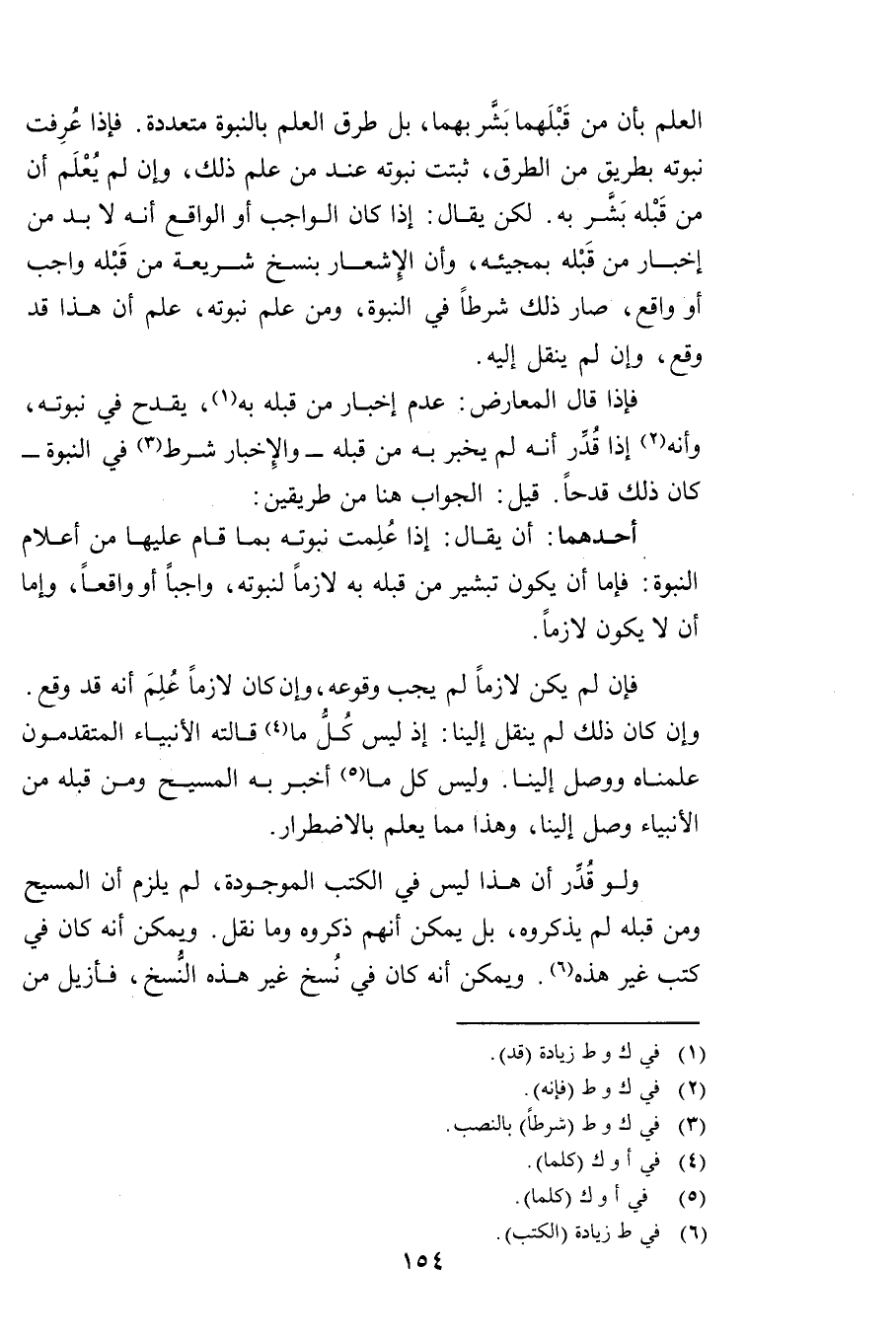 أَحَدُهُمَا أَنْ يُقَالَ: إِذَا عُلِمَتْ نُبُوَّتُهُ بِمَا قَامَ عَلَيْهَا مِنْ أَعْلَامِ النُّبُوَّةِ؛ فَإِمَّا أَنْ يَكُونَ تَبْشِيرُ مَنْ قَبْلَهُ لَازِمًا لِنُبُوَّتِهِ وَاجِبًا أَوْ أَوْ وَاقِعًا، وَإِمَّا أَنْ لَا يَكُونَ لَازِمًا.