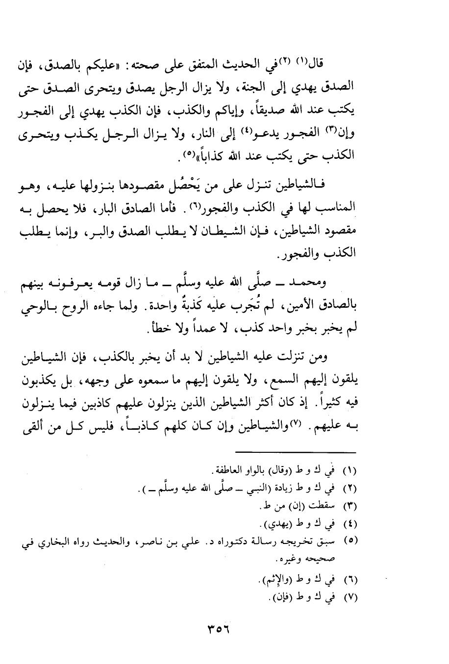 فَالشَّيَاطِينُ تَنْزِلُ عَلَى مَنْ يَحْصُلُ مَقْصُودُهَا بِنُزُولِهَا عَلَيْهِ، وَهُوَ الْمُنَاسِبُ لَهَا فِي الْكَذِبِ وَالْفُجُورِ. فَأَمَّا الصَّادِقُ الْبَارُّ، فَلَا يَحْصُلُ بِهِ مَقْصُودُ الشَّيَاطِينِ، فَإِنَّ الشَّيْطَانَ لَا يَطْلُبُ الصِّدْقَ وَالْبِرَّ، وَإِنَّمَا يَطْلُبُ الْكَذِبَ وَالْفُجُورَ.