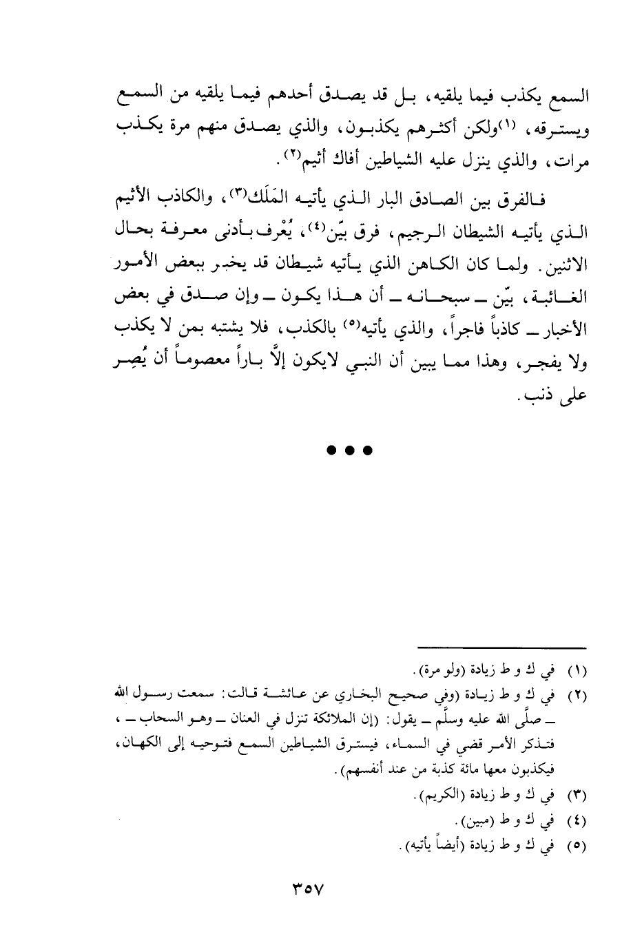 فَالْفَرْقُ بَيْنَ الصَّادِقِ الْبَارِّ الَّذِي يَأْتِيهِ الْمَلَكُ، وَالْكَاذِبِ الْأَثِيمِ الَّذِي يَأْتِيهِ الشَّيْطَانُ الرَّجِيمُ، فَرْقٌ بَيِّنٌ، يُعْرَفُ بِأَدْنَى مَعْرِفَةٍ بِحَالِ الِاثْنَيْنِ، وَلَمَّا كَانَ الْكَاهِنُ الَّذِي يَأْتِيهِ شَيْطَانٌ قَدْ يُخْبِرُ بِبَعْضِ الْأُمُورِ الْغَائِبَةِ بَيَّنَ سُبْحَانَهُ أَنَّ هَذَا يَكُونُ - وَإِنْ صَدَقَ فِي بَعْضِ الْأَخْبَارِ - كَاذِبًا فَاجِرًا، وَالَّذِي يَأْتِيهِ بِالْكَذِبِ، فَلَا يَشْتَبِهُ بِمَنْ لَا يَكْذِبُ وَلَا يَفْجُرُ، وَهَذَا مِمَّا يُبَيِّنُ أَنَّ النَّبِيَّ لَا يَكُونُ إِلَّا بَارًّا مَعْصُومًا أَنْ يُصِرَّ عَلَى ذَنْبٍ.