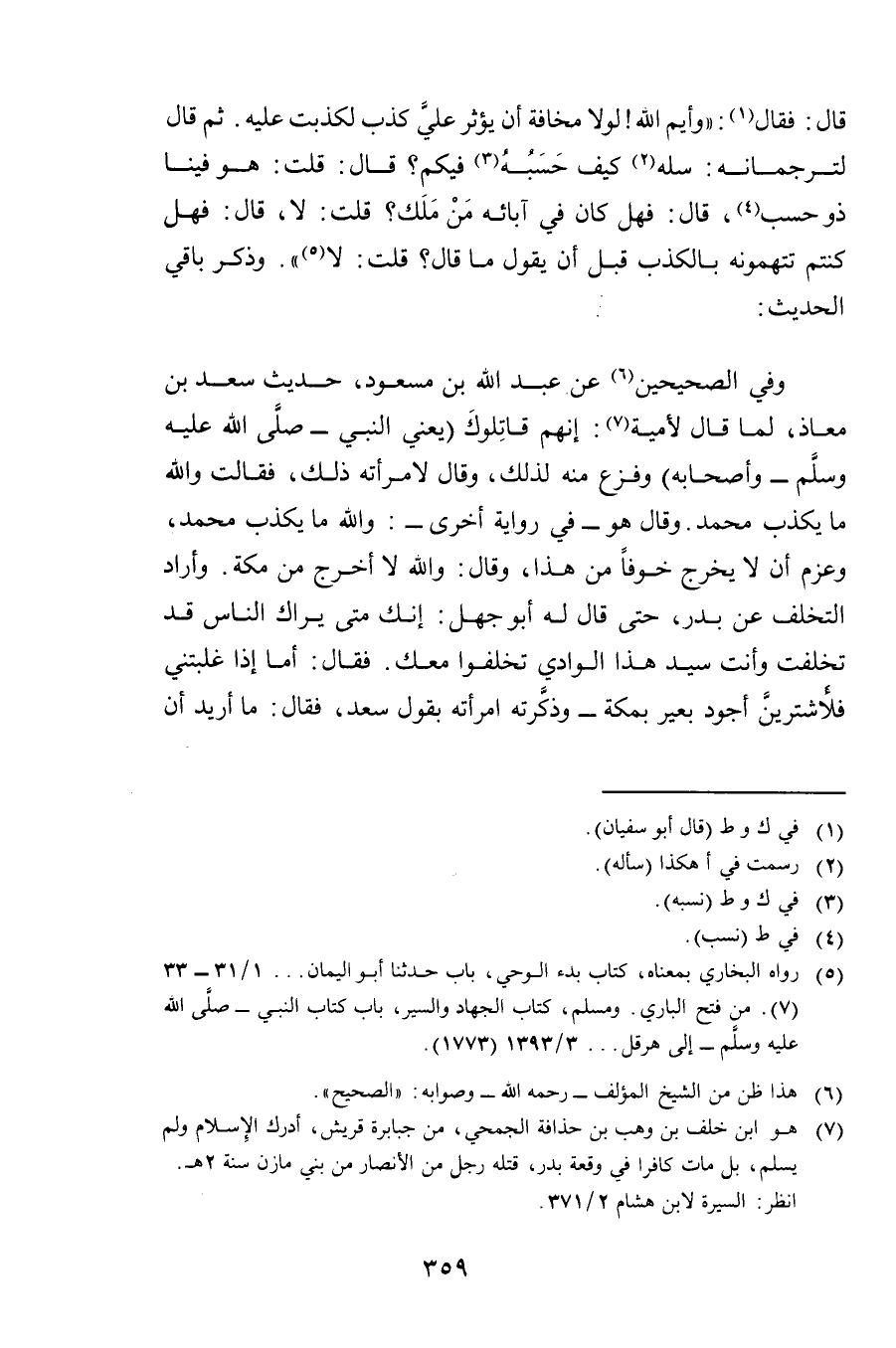 وَفِي الصَّحِيحَيْنِ عَنْ عَبْدِ اللَّهِ بْنِ مَسْعُودٍ، حَدِيثُ سَعْدِ بْنِ مُعَاذٍ، لَمَّا قَالَ لِأُمَيَّةَ: إِنَّهُمْ قَاتِلُوكَ (يَعْنِي النَّبِيَّ صَلَّى اللَّهُ عَلَيْهِ وَسَلَّمَ وَأَصْحَابَهُ) ، وَفَزِعَ مِنْهُ لِذَلِكَ، وَقَالَ لِامْرَأَتِهِ ذَلِكَ، فَقَالَتْ: وَاللَّهِ مَا يَكْذِبُ مُحَمَّدٌ، وَقَالَ هُوَ - فِي رِوَايَةٍ أُخْرَى -: وَاللَّهِ مَا يَكْذِبُ مُحَمَّدٌ، وَعَزَمَ أَنْ لَا يَخْرُجَ خَوْفًا مِنْ هَذَا، وَقَالَ: وَاللَّهِ لَا أَخْرُجُ مِنْ مَكَّةَ. وَأَرَادَ التَّخَلُّفَ عَنْ بَدْرٍ، حَتَّى قَالَ لَهُ أَبُو جَهْلٍ: إِنَّكَ مَتَى يَرَاكَ النَّاسُ قَدْ تَخَلَّفْتَ وَأَنْتَ سَيِّدُ هَذَا الْوَادِي تَخَلَّفُوا مَعَكَ. فَقَالَ: أَمَّا إِذْ غَلَبْتَنِي فَلَأَشْتَرِيَنَّ أَجْوَدَ بَعِيرٍ بِمَكَّةَ، وَذَكَّرَتْهُ امْرَأَتُهُ بِقَوْلِ سَعْدٍ، فَقَالَ: مَا أُرِيدُ أَنْ