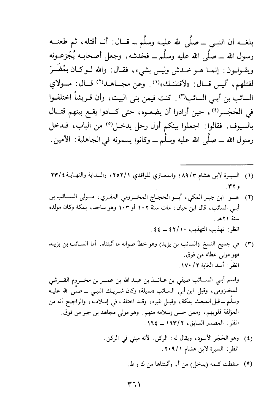 بَلَغَهُ أَنَّ النَّبِيَّ صَلَّى اللَّهُ عَلَيْهِ وَسَلَّمَ قَالَ: أَنَا أَقْتُلُهُ، ثُمَّ طَعَنَهُ رَسُولُ اللَّهِ صَلَّى اللَّهُ عَلَيْهِ وَسَلَّمَ فَخَدَشَهُ، وَجَعَلَ أَصْحَابُهُ يُجَزِّعُونَهُ وَيَقُولُونَ: إِنَّمَا هُوَ خَدْشٌ وَلَيْسَ بِشَيْءٍ، فَقَالَ: وَاللَّهِ لَوْ كَانَ بِمُضَرَ لَقَتَلَهُمْ، أَلَيْسَ قَالَ: " لَأَقْتُلَنَّكَ» . وَعَنْ مُجَاهِدٍ: قَالَ مَوْلَايَ السَّائِبُ بْنُ أَبِي السَّائِبِ: كُنْتُ فِيمَنْ بَنَى الْبَيْتَ، وَأَنَّ قُرَيْشًا اخْتَلَفُوا فِي الْحَجَرِ حِينَ أَرَادُوا أَنْ يَضَعُوهُ، حَتَّى كَادُوا يَقَعُ بَيْنَهُمْ قِتَالٌ بِالسُّيُوفِ، فَقَالَ: اجْعَلُوا بَيْنَكُمْ أَوَّلَ رَجُلٍ يَدْخُلُ مِنَ الْبَابِ، فَدَخَلَ رَسُولُ اللَّهِ صَلَّى اللَّهُ عَلَيْهِ وَسَلَّمَ وَكَانُوا يُسَمُّونَهُ فِي الْجَاهِلِيَّةِ الْأَمِينَ.