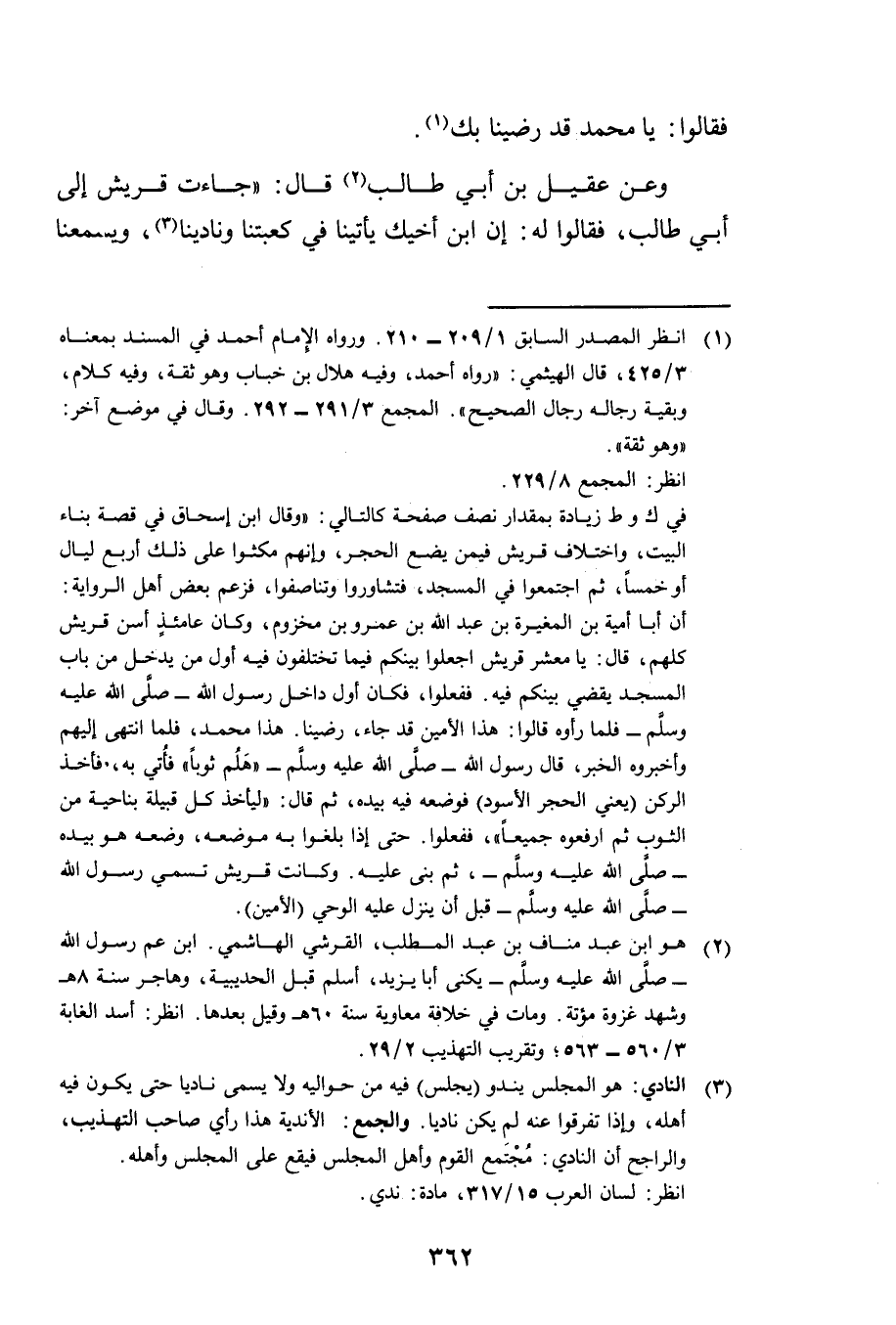 وَعَنْ عَقِيلِ بْنِ أَبِي طَالِبٍ قَالَ: " «جَاءَتْ قُرَيْشٌ إِلَى أَبِي طَالِبٍ فَقَالُوا لَهُ: إِنَّ ابْنَ أَخِيكَ يَأْتِينَا فِي كَعْبَتِنَا وَنَادِينَا وَيُسْمِعُنَا