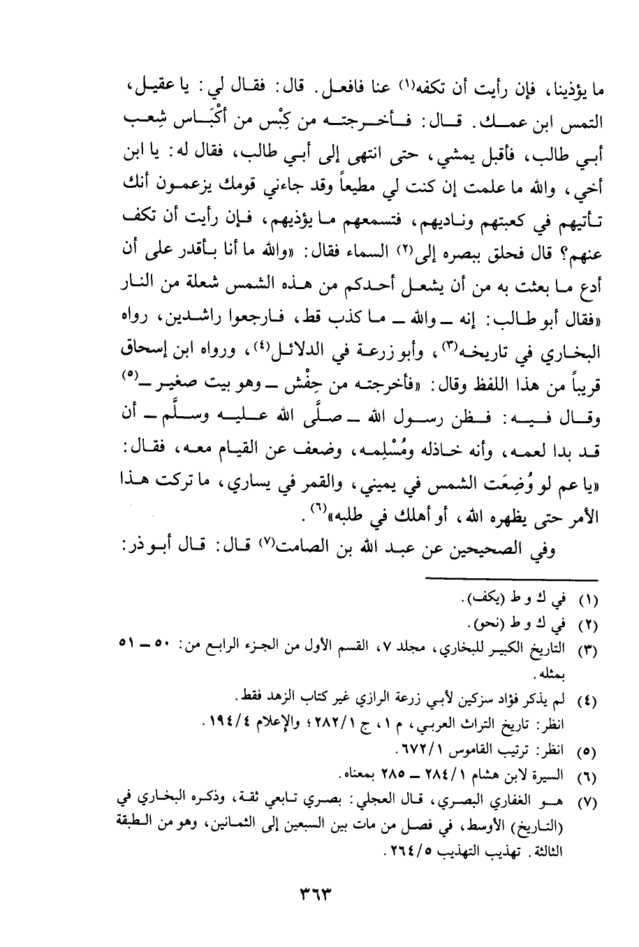 مَا يُؤْذِينَا، فَإِنْ رَأَيْتَ أَنْ تَكُفَّهُ عَنَّا فَافْعَلْ. قَالَ: فَقَالَ لِي: يَا عَقِيلُ الْتَمِسِ ابْنَ عَمِّكَ. قَالَ: فَأَخْرَجْتُهُ مِنْ كِبْسٍ مِنْ أَكْبَاسِ شِعْبِ أَبِي طَالِبٍ، فَأَقْبَلَ يَمْشِي حَتَّى انْتَهَى إِلَى أَبِي طَالِبٍ، فَقَالَ لَهُ: يَا ابْنَ أَخِي، وَاللَّهِ مَا عَلِمْتُ إِنْ كُنْتَ لِي مُطِيعًا، وَقَدْ جَاءَنِي قَوْمُكَ يَزْعُمُونَ أَنَّكَ تَأْتِيهِمْ فِي كَعْبَتِهِمْ وَنَادِيهِمْ فَتُسْمِعُهُمْ مَا يُؤْذِيهِمْ، فَإِنْ رَأَيْتَ أَنْ تَكُفَّ عَنْهُمْ؟ قَالَ: فَحَلَّقَ بِبَصَرِهِ إِلَى السَّمَاءِ، فَقَالَ: وَاللَّهِ مَا أَنَا بِأَقْدَرَ عَلَى أَنْ أَدَعَ مَا بُعِثْتُ بِهِ مِنْ أَنْ يُشْعِلَ أَحَدُكُمْ مِنْ هَذِهِ الشَّمْسِ شُعْلَةً مِنَ النَّارِ فَقَالَ أَبُو طَالِبٍ: إِنَّهُ - وَاللَّهِ - مَا كَذَبَ قَطُّ فَارْجِعُوا رَاشِدِينَ» . رَوَاهُ الْبُخَارِيُّ فِي تَارِيخِهِ، وَأَبُو زُرْعَةَ فِي الدَّلَائِلِ، وَرَوَاهُ ابْنُ إِسْحَاقَ قَرِيبًا مِنْ هَذَا اللَّفْظِ، وَقَالَ: " فَأَخْرَجْتُهُ مِنْ حِفْشٍ - وَهُوَ بَيْتٌ صَغِيرٌ - وَقَالَ فِيهِ: فَظَنَّ رَسُولُ اللَّهِ صَلَّى اللَّهُ عَلَيْهِ وَسَلَّمَ أَنْ قَدْ بَدَا لِعَمِّهِ، وَأَنَّهُ خَاذِلُهُ وَمُسْلِمُهُ، وَضَعُفَ عَنِ الْقِيَامِ مَعَهُ، فَقَالَ: «يَا عَمِّ لَوْ وُضِعَتِ الشَّمْسُ فِي يَمِينِي وَالْقَمَرُ فِي يَسَارِي مَا تَرَكْتُ هَذَا الْأَمْرَ حَتَّى يُظْهِرَهُ اللَّهُ أَوْ أَهْلِكَ فِي طَلَبِهِ» .