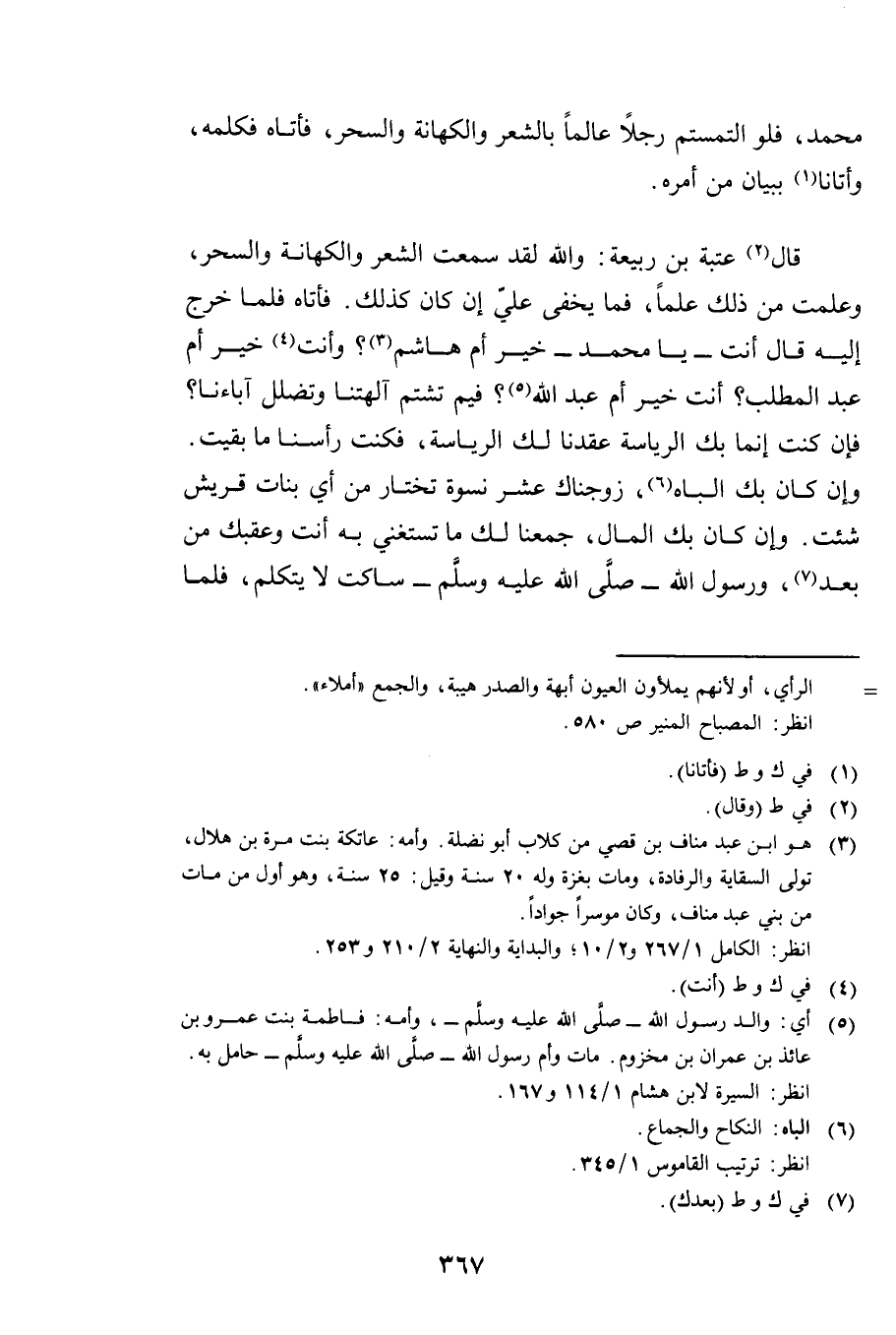 قَالَ عُتْبَةُ بْنُ رَبِيعَةَ: وَاللَّهِ لَقَدْ سَمِعْتُ الشِّعْرَ وَالْكِهَانَةَ وَالسِّحْرَ، وَعَلِمْتُ مِنْ ذَلِكَ عِلْمًا، فَمَا يَخْفَى عَلَيَّ إِنْ كَانَ كَذَلِكَ. فَأَتَاهُ، فَلَمَّا خَرَجَ إِلَيْهِ قَالَ: أَنْتَ - يَا مُحَمَّدُ - خَيْرٌ أَمْ هَاشِمٌ؟ وَأَنْتَ خَيْرٌ أَمْ عَبْدُ الْمُطَّلِبِ؟ أَنْتَ خَيْرٌ أَمْ عَبْدُ اللَّهِ؟ فِيمَ تَشْتُمُ آلِهَتَنَا، وَتُضَلِّلُ آبَاءَنَا؟ فَإِنْ كُنْتَ إِنَّمَا بِكَ الرِّيَاسَةُ عَقَدْنَا لَكَ الرِّيَاسَةَ، فَكُنْتَ رَأْسَنَا مَا بَقِيتَ، وَإِنْ كَانَ بِكَ الْبَاهُ زَوَّجْنَاكَ عَشْرَ نِسْوَةٍ تَخْتَارُ مِنْ أَيِّ بَنَاتِ قُرَيْشٍ شِئْتَ، وَإِنْ كَانَ بِكَ الْمَالُ، جَمَعْنَا لَكَ مَا تَسْتَغْنِي بِهِ أَنْتَ وَعَقِبُكَ مِنْ بَعْدُ، وَرَسُولُ اللَّهِ صَلَّى اللَّهُ عَلَيْهِ وَسَلَّمَ سَاكِتٌ لَا يَتَكَلَّمُ، فَلَمَّا