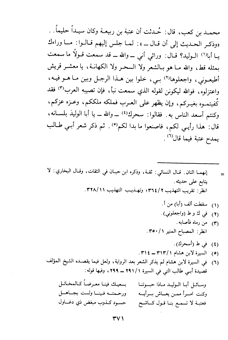 مُحَمَّدِ بْنِ كَعْبٍ، قَالَ: حُدِّثْتُ أَنَّ عُتْبَةَ بْنَ رَبِيعَةَ وَكَانَ سَيِّدًا حَلِيمًا. . وَذَكَرَ الْحَدِيثَ إِلَى أَنْ قَالَ: " لَمَّا جَلَسَ إِلَيْهِمْ قَالُوا: مَا وَرَاءَكَ يَا أَبَا الْوَلِيدِ، قَالَ: وَرَائِي أَنِّي - وَاللَّهِ - قَدْ سَمِعْتُ قَوْلًا مَا سَمِعْتُ بِمِثْلِهِ قَطُّ، وَاللَّهِ مَا هُوَ بِالشِّعْرِ وَلَا السِّحْرِ وَلَا الْكِهَانَةِ، يَا مَعْشَرَ قُرَيْشٍ أَطِيعُونِي، وَاجْعَلُوهَا بِي، خَلُّوا بَيْنَ هَذَا الرَّجُلِ وَبَيْنَ مَا هُوَ فِيهِ، وَاعْتَزِلُوهُ، فَوَاللَّهِ لَيَكُونَنَّ لِقَوْلِهِ الَّذِي سَمِعْتُ نَبَأٌ، فَإِنْ تُصِيبُهُ الْعَرَبُ فَقَدْ كَفَيْتُمُوهُ بِغَيْرِكُمْ، وَإِنْ يَظْهَرْ عَلَى الْعَرَبِ فَمُلْكُهُ مُلْكُكُمْ، وَعِزُّهُ عِزُّكُمْ، وَكُنْتُمْ أَسْعَدَ النَّاسِ بِهِ، فَقَالُوا: سَحَرَكَ - وَاللَّهِ - يَا أَبَا الْوَلِيدِ بِلِسَانِهِ، قَالَ: هَذَا رَأْيِي لَكُمْ فَاصْنَعُوا مَا بَدَا لَكُمْ،. ثُمَّ ذَكَرَ شِعْرَ أَبِي طَالِبٍ يَمْدَحُ عُتْبَةَ فِيمَا قَالَ.