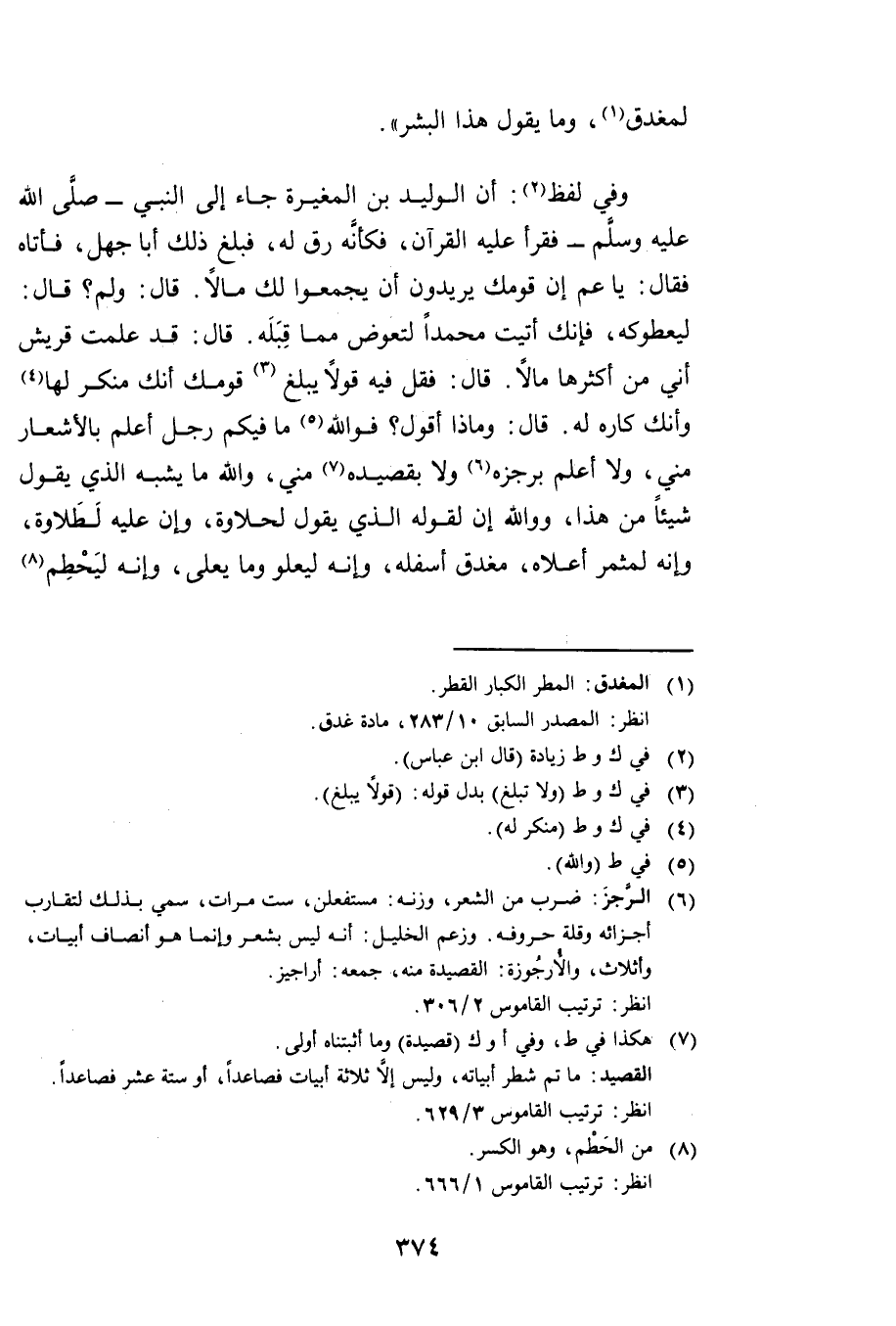 وَفِي لَفْظٍ: أَنَّ الْوَلِيدَ بْنَ الْمُغِيرَةِ جَاءَ إِلَى النَّبِيِّ صَلَّى اللَّهُ عَلَيْهِ وَسَلَّمَ فَقَرَأَ عَلَيْهِ الْقُرْآنَ، فَكَأَنَّهُ رَقَّ لَهُ، فَبَلَغَ ذَلِكَ أَبَا جَهْلٍ، فَأَتَاهُ فَقَالَ: يَا عَمِّ، إِنَّ قَوْمَكَ يُرِيدُونَ أَنْ يَجْمَعُوا لَكَ مَالًا. قَالَ: وَلِمَ؟ قَالَ: لِيُعْطُوكَهُ، فَإِنَّكَ أَتَيْتَ مُحَمَّدًا لِتُعَوَّضَ مِمَّا قِبَلَهُ، قَالَ: قَدْ عَلِمَتْ قُرَيْشٌ أَنِّي مِنْ أَكْثَرِهَا مَالًا، قَالَ: فَقُلْ فِيهِ قَوْلًا يَبْلُغُ قَوْمَكَ أَنَّكَ مُنْكِرٌ لَهُ وَأَنَّكَ كَارِهٌ لَهُ، قَالَ: وَمَاذَا أَقُولُ؟ فَوَاللَّهِ مَا فِيكُمْ رَجُلٌ أَعْلَمُ بِالْأَشْعَارِ مِنِّي، وَلَا أَعْلَمُ بِرَجْزِهِ وَلَا بِقَصِيدِهِ مِنِّي، وَاللَّهِ مَا يُشْبِهُ الَّذِي يَقُولُ شَيْئًا مِنْ هَذَا، وَوَاللَّهِ إِنَّ لِقَوْلِهِ الَّذِي يَقُولُهُ لَحَلَاوَةً، وَإِنَّ عَلَيْهِ لَطَلَاوَةً، وَإِنَّهُ لَمُثْمِرٌ أَعْلَاهُ، مُغْدِقٌ أَسْفَلُهُ، وَإِنَّهُ لَيَعْلُو وَمَا يُعْلَى، وَإِنَّهُ لَيَحْطِمُ