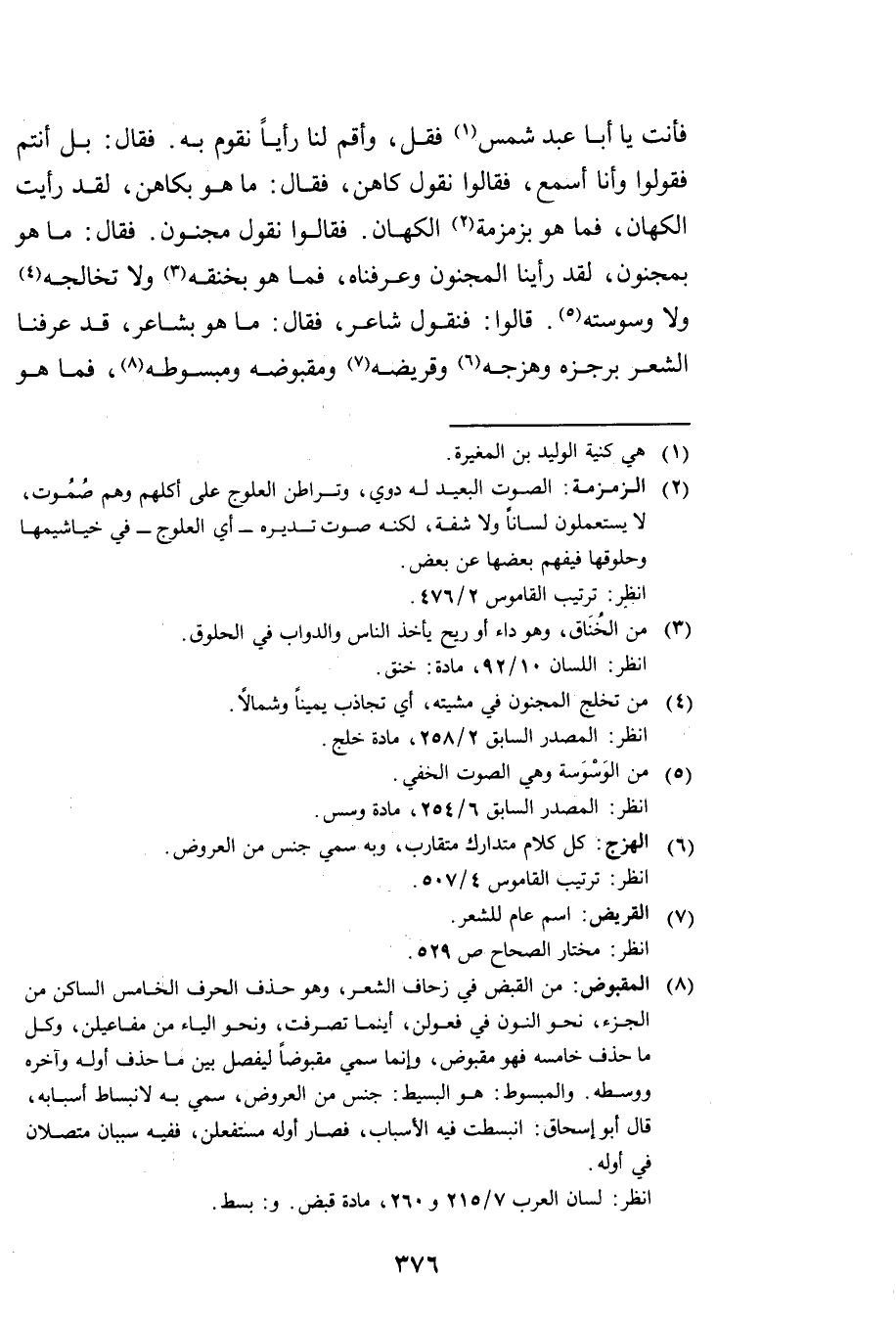 فَأَنْتَ يَا أَبَا عَبْدِ شَمْسٍ فَقُلْ، وَأَقِمْ لَنَا رَأْيًا نَقُومُ بِهِ. فَقَالَ: بَلْ أَنْتُمْ فَقُولُوا وَأَنَا أَسْمَعُ، فَقَالُوا: نَقُولُ كَاهِنٌ، فَقَالَ: مَا هُوَ بِكَاهِنٍ، لَقَدْ رَأَيْتُ الْكُهَّانَ فَمَا هُوَ بِزَمْزَمَةِ الْكُهَّانِ. فَقَالُوا: نَقُولُ مَجْنُونٌ، فَقَالَ: مَا هُوَ بِمَجْنُونٍ، لَقَدْ رَأَيْنَا الْمَجْنُونَ وَعَرَفْنَاهُ فَمَا هُوَ بِخَنَقِهِ وَلَا تَخَالُجِهِ وَلَا وَسْوَسَتِهِ. قَالُوا: فَنَقُولُ شَاعِرٌ، فَقَالَ: مَا هُوَ بِشَاعِرٍ، قَدْ عَرَفْنَا الشِّعْرَ بِرَجَزِهِ وَهَزَجِهِ وَقَرِيظِهِ وَمَقْبُوضِهِ وَمَبْسُوطِهِ فَمَا هُوَ