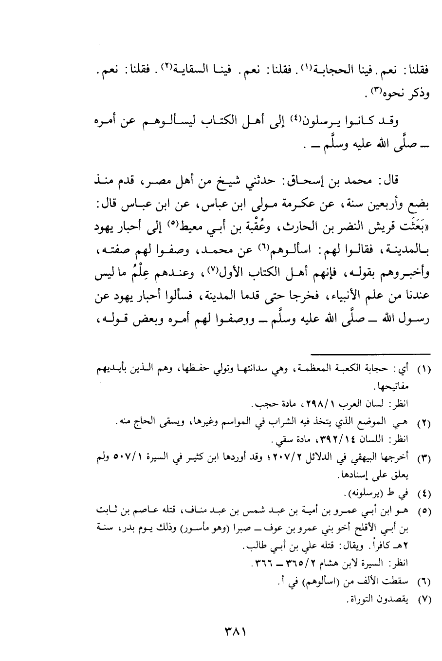 قَالَ مُحَمَّدُ بْنُ إِسْحَاقَ حَدَّثَنِي شَيْخٌ مِنْ أَهْلِ مِصْرَ قَدِمَ مُنْذُ بِضْعٍ وَأَرْبَعِينَ سَنَةً عَنْ عِكْرِمَةَ مَوْلَى ابْنِ عَبَّاسٍ، عَنِ ابْنِ عَبَّاسٍ قَالَ: " بَعَثَتْ قُرَيْشٌ النَّضْرَ بْنَ الْحَارِثِ، وَعُقْبَةَ بْنَ أَبِي مُعَيْطٍ إِلَى أَحْبَارِ يَهُودَ بِالْمَدِينَةِ، فَقَالُوا لَهُمْ: اسْأَلُوهُمْ عَنْ مُحَمَّدٍ، وَصِفُوا لَهُمْ صِفَتَهُ، وَأَخْبِرُوهُمْ بِقَوْلِهِ، فَإِنَّهُمْ أَهْلُ الْكِتَابِ الْأَوَّلِ، وَعِنْدَهُمْ عِلْمُ مَا لَيْسَ عِنْدَنَا مِنْ عِلْمِ الْأَنْبِيَاءِ، فَخَرَجَا حَتَّى قَدِمَا الْمَدِينَةَ، فَسَأَلُوا أَحْبَارَ يَهُودَ عَنْ رَسُولِ اللَّهِ صَلَّى اللَّهُ عَلَيْهِ وَسَلَّمَ وَوَصَفُوا لَهُمْ أَمْرَهُ وَبَعْضَ قَوْلِهِ