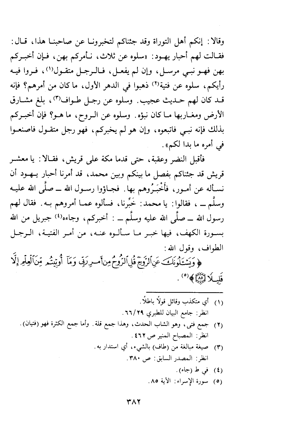 فَأَقْبَلَ النَّضْرُ وَعُقْبَةُ، حَتَّى قَدِمَا مَكَّةَ عَلَى قُرَيْشٍ، فَقَالَا: يَا مَعْشَرَ قُرَيْشٍ قَدْ جِئْنَاكُمْ بِفَصْلِ مَا بَيْنَكُمْ وَبَيْنَ مُحَمَّدٍ، قَدْ أَمَرَنَا أَحْبَارُ يَهُودَ أَنْ نَسْأَلَهُ عَنْ أُمُورٍ، فَأَخْبَرُوهُمْ بِهَا فَجَاءُوا رَسُولَ اللَّهِ صَلَّى اللَّهُ عَلَيْهِ وَسَلَّمَ فَقَالُوا: يَا مُحَمَّدُ، خَبِّرْنَا فَسَأَلُوهُ عَمَّا أَمَرُوهُمْ بِهِ. فَقَالَ: لَهُمْ رَسُولُ اللَّهِ صَلَّى اللَّهُ عَلَيْهِ وَسَلَّمَ أُخْبِرُكُمْ، وَجَاءَهُ جِبْرِيلُ مِنَ اللَّهِ بِسُورَةِ الْكَهْفِ، فِيهَا خَبَرُ مَا سَأَلُوهُ عَنْهُ، مِنْ أَمْرِ الْفِتْيَةِ، وَالرَّجُلِ الطَّوَّافِ، وَقَوْلِ اللَّهِ: