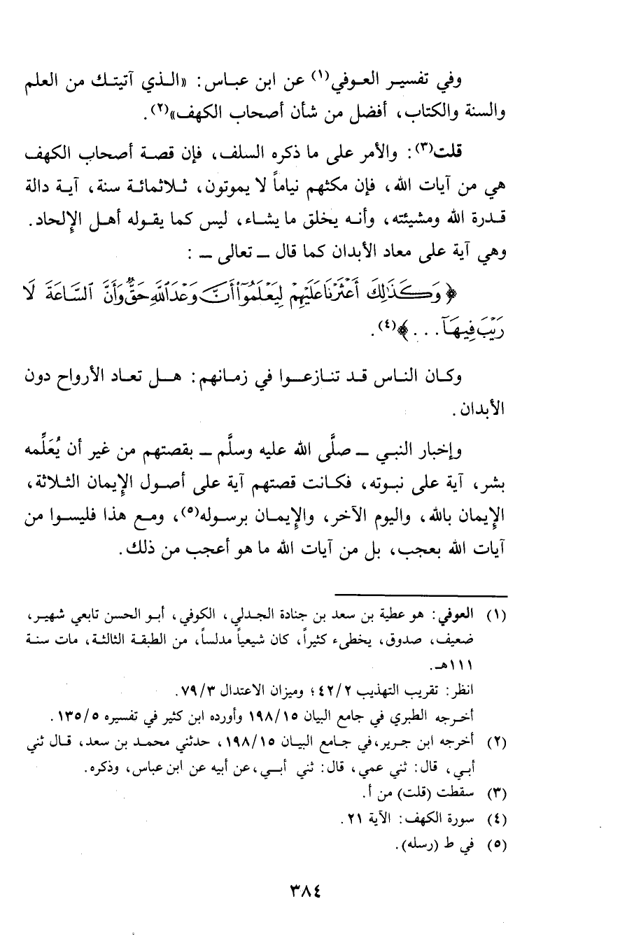 وَفِي تَفْسِيرِ الْعَوْفِيِّ عَنِ ابْنِ عَبَّاسٍ: " الَّذِي آتَيْتُكَ مِنَ الْعِلْمِ وَالسُّنَّةِ وَالْكِتَابِ، أَفْضَلُ مِنْ شَأْنِ أَصْحَابِ الْكَهْفِ ".