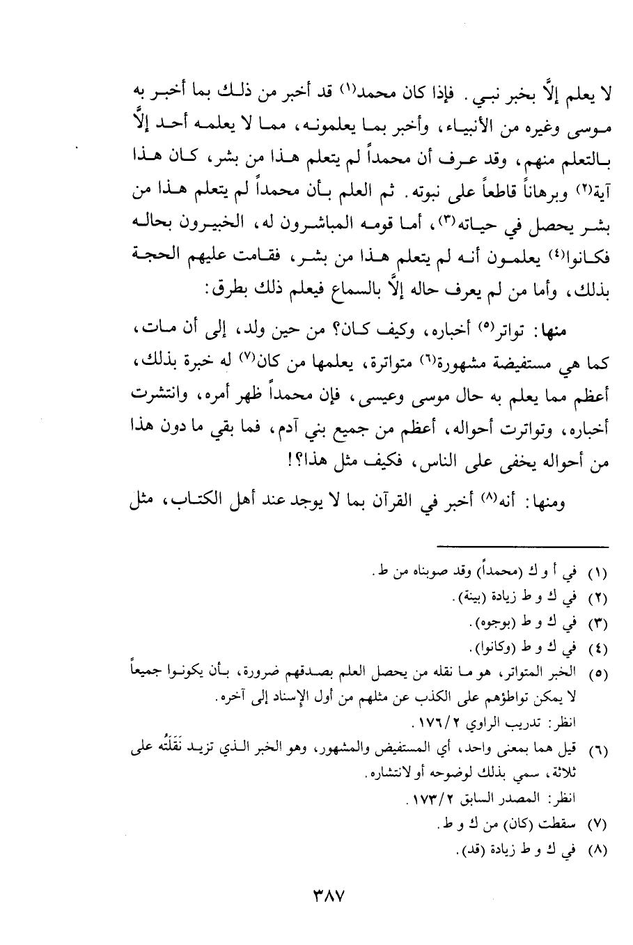 لَا يُعْلَمُ إِلَّا بِخَبَرِ نَبِيٍّ. فَإِذَا كَانَ مُحَمَّدٌ قَدْ أُخْبِرَ مِنْ ذَلِكَ بِمَا أُخْبِرَ بِهِ مُوسَى وَغَيْرُهُ مِنَ الْأَنْبِيَاءِ، وَأُخْبِرَ بِمَا يَعْلَمُونَهُ مِمَّا لَا يَعْلَمُهُ أَحَدٌ إِلَّا بِالتَّعَلُّمِ مِنْهُمْ، وَقَدْ عُرِفَ أَنَّ مُحَمَّدًا لَمْ يَتَعَلَّمْ هَذَا مِنْ بَشَرٍ، كَانَ هَذَا آيَةً وَبُرْهَانًا قَاطِعًا عَلَى نُبُوَّتِهِ،. ثُمَّ الْعِلْمُ بِأَنَّ مُحَمَّدًا لَمْ يَتَعَلَّمْ هَذَا مِنْ بَشَرٍ يَحْصُلُ فِي حَيَاتِهِ، أَمَّا قَوْمُهُ الْمُبَاشِرُونَ لَهُ، الْخَبِيرُونَ بِحَالِهِ، فَكَانُوا يَعْلَمُونَ أَنَّهُ لَمْ يَتَعَلَّمْ هَذَا مِنْ بَشَرٍ، فَقَامَتْ عَلَيْهِمُ الْحُجَّةُ بِذَلِكَ، وَأَمَّا مَنْ لَمْ يَعْرِفْ حَالَهُ إِلَّا بِالسَّمَاعِ فَيَعْلَمُ ذَلِكَ بِطُرُقٍ: