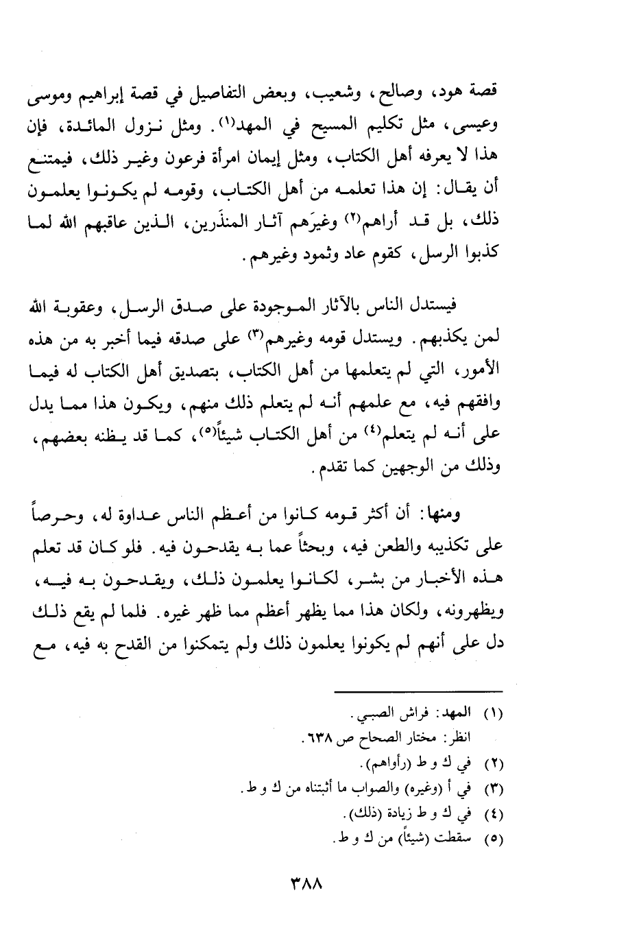 قِصَّةِ هُودٍ وَصَالِحٍ وَشُعَيْبٍ، وَبَعْضِ التَّفَاصِيلِ فِي قِصَّةِ إِبْرَاهِيمَ وَمُوسَى وَعِيسَى؛ مِثْلُ تَكْلِيمِ الْمَسِيحِ فِي الْمَهْدِ، وَمِثْلُ نُزُولِ الْمَائِدَةِ، فَإِنَّ هَذَا لَا يَعْرِفُهُ أَهْلُ الْكِتَابِ، وَمِثْلُ إِيمَانِ امْرَأَةِ فِرْعَوْنَ، وَغَيْرِ ذَلِكَ. فَيَمْتَنِعُ أَنْ يُقَالَ: إِنَّ هَذَا تَعَلَّمَهُ مِنْ أَهْلِ الْكِتَابِ، وَقَوْمُهُ لَمْ يَكُونُوا يَعْلَمُونَ ذَلِكَ، بَلْ قَدْ أَرَاهُمْ وَغَيْرَهُمْ آثَارَ الْمُنْذَرِينَ الَّذِينَ عَاقَبَهُمُ اللَّهُ لَمَّا كَذَّبُوا الرُّسُلَ، كَقَوْمِ عَادٍ وَثَمُودَ، وَغَيْرِهِمْ.
