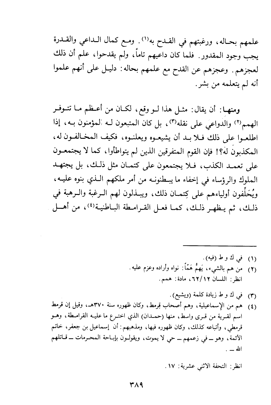 وَمِنْهَا: أَنْ يُقَالَ: مِثْلُ هَذَا لَوْ وَقَعَ لَكَانَ مِنْ أَعْظَمِ مَا تَتَوَفَّرُ الْهِمَمُ وَالدَّوَاعِي عَلَى نَقْلِهِ، بَلْ كَانَ الْمُتَّبِعُونَ لَهُ الْمُؤْمِنُونَ بِهِ إِذَا اطَّلَعُوا عَلَى ذَلِكَ فَلَا بُدَّ أَنْ يُشِيعُوهُ وَيُعْلِنُوهُ، فَكَيْفَ الْمُخَالِفُونَ لَهُ، الْمُكَذِّبُونَ لَهُ؟ فَإِنَّ الْقَوْمَ الْمُتَفَرِّقِينَ الَّذِينَ لَمْ يَتَوَاطَئُوا، كَمَا لَا يَجْتَمِعُونَ عَلَى تَعَمُّدِ الْكَذِبِ، فَلَا يَجْتَمِعُونَ عَلَى كِتْمَانِ مِثْلِ ذَلِكَ، بَلْ يَجْتَهِدُ الْمُلُوكُ وَالرُّؤَسَاءُ فِي إِخْفَاءِ مَا يُبْطِنُونَهُ مِنْ أَمْرِ مُلْكِهِمُ الَّذِي بَنَوْهُ عَلَيْهِ، وَيُحَلِّفُونَ أَوْلِيَاءَهُمْ عَلَى كِتْمَانِ ذَلِكَ، وَيَبْذُلُونَ لَهُمُ الرَّغْبَةَ وَالرَّهْبَةَ فِي ذَلِكَ، ثُمَّ يَظْهَرُ ذَلِكَ كَمَا فَعَلَ الْقَرَامِطَةُ الْبَاطِنِيَّةُ، مَنْ أَهْلِ