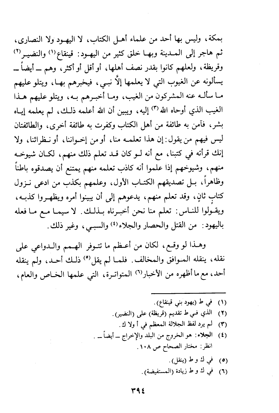بِمَكَّةَ، وَلَيْسَ بِهَا أَحَدٌ مِنْ عُلَمَاءِ أَهْلِ الْكِتَابِ، لَا الْيَهُودِ وَلَا النَّصَارَى، ثُمَّ هَاجَرَ إِلَى الْمَدِينَةِ، وَبِهَا خَلْقٌ كَثِيرٌ مِنَ الْيَهُودِ ; قَيْنُقَاعَ وَالنَّضِيرِ وَقُرَيْظَةَ، وَلَعَلَّهُمْ كَانُوا بِقَدْرِ نِصْفِ أَهْلِهَا، أَوْ أَقَلَّ أَوْ أَكْثَرَ، وَهُمْ - أَيْضًا - يَسْأَلُونَهُ عَنِ الْغُيُوبِ الَّتِي لَا يَعْلَمُهَا إِلَّا نَبِيٌّ فَيُخْبِرُهُمْ بِهَا، وَيَتْلُو عَلَيْهِمْ مَا سَأَلَهُ عَنْهُ الْمُشْرِكُونَ مِنَ الْغَيْبِ، وَمَا أَخْبَرَهُمْ بِهِ، وَيَتْلُو عَلَيْهِمْ هَذَا الْغَيْبَ الَّذِي أَوْحَاهُ اللَّهُ إِلَيْهِ، وَيُبَيِّنُ أَنَّ اللَّهَ أَعْلَمُهُ ذَلِكَ، لَمْ يُعْلِمْهُ إِيَّاهُ بَشَرٌ، فَآمَنَ بِهِ طَائِفَةٌ مِنْ أَهْلِ الْكِتَابِ وَكَفَرَتْ بِهِ طَائِفَةٌ أُخْرَى، وَالطَّائِفَتَانِ لَيْسَ فِيهِمْ مَنْ يَقُولُ: إِنَّ هَذَا تَعَلَّمَهُ مِنَّا أَوْ مِنْ إِخْوَانِنَا أَوْ نُظَرَائِنَا، وَلَا إِنَّكَ قَرَأْتَهُ فِي كُتُبِنَا. مَعَ أَنَّهُ لَوْ كَانَ قَدْ تَعَلَّمَ ذَلِكَ مِنْهُمْ لَكَانَ شُيُوخُهُ مِنْهُمْ، وَشُيُوخُهُمْ إِذَا عَلِمُوا أَنَّهُ كَاذِبٌ تَعَلَّمَهُ مِنْهُمْ، يَمْتَنِعُ أَنْ يُصَدِّقُوهُ بَاطِنًا وَظَاهِرًا، بَلْ تَصْدِيقُهُمُ الْكِتَابَ الْأَوَّلَ، وَعِلْمُهُمْ بِكَذِبِ مَنِ ادَّعَى نُزُولَ كِتَابٍ ثَانٍ وَقَدْ تَعَلَّمَ مِنْهُمْ يَدْعُوهُمْ إِلَى أَنْ يُبَيِّنُوا أَمْرَهُ، وَيُظْهِرُوا كَذِبَهُ، وَيَقُولُوا لِلنَّاسِ تَعَلَّمَ مِنَّا، نَحْنُ أَخْبَرْنَاهُ بِذَلِكَ، لَا سِيَّمَا مَعَ مَا فَعَلَهُ بِالْيَهُودِ مِنَ الْقَتْلِ وَالْحِصَارِ وَالْجَلَاءِ وَالسَّبْيِ، وَغَيْرِ ذَلِكَ.