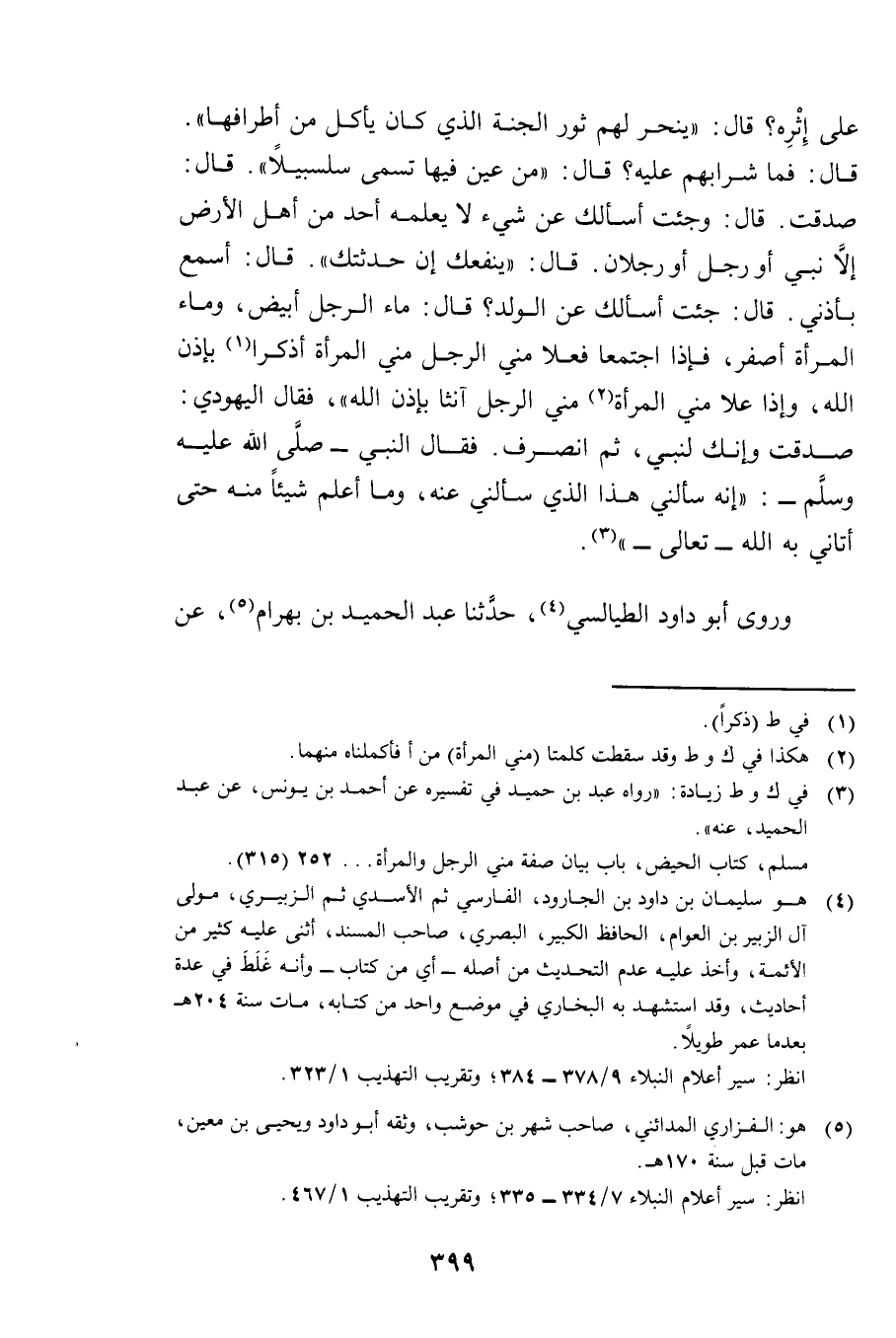 عَلَى أَثَرِهِ؟ قَالَ: يُنْحَرُ لَهُمْ ثَوْرُ الْجَنَّةِ الَّذِي كَانَ يَأْكُلُ مِنْ أَطْرَافِهَا قَالَ: فَمَا شَرَابُهُمْ عَلَيْهِ؟ قَالَ: مِنْ عَيْنٍ فِيهَا تُسَمَّى سَلْسَبِيلًا قَالَ: صَدَقْتَ. قَالَ: وَجِئْتُ أَسْأَلُكَ عَنْ شَيْءٍ لَا يَعْلَمُهُ أَحَدٌ مِنْ أَهْلِ الْأَرْضِ إِلَّا نَبِيٌّ أَوْ رَجُلٌ أَوْ رَجُلَانِ، قَالَ: يَنْفَعُكَ إِذَا حَدَّثْتُكَ قَالَ: أَسْمَعُ بِأُذُنِي، قَالَ: جِئْتُ أَسْأَلُكَ عَنِ الْوَلَدِ، قَالَ: مَاءُ الرَّجُلِ أَبْيَضُ، وَمَاءُ الْمَرْأَةِ أَصْفَرُ، فَإِذَا اجْتَمَعَا فَعَلَا مَنِيُّ الرَّجُلِ مَنِيَّ الْمَرْأَةِ أَذْكَرَا بِإِذْنِ اللَّهِ، وَإِذَا عَلَا مِنَيُّ الْمَرْأَةِ مَنِيَّ الرَّجُلِ آنَثَا بِإِذْنِ اللَّهِ فَقَالَ: الْيَهُودِيُّ صَدَقْتَ، وَإِنَّكَ لَنَبِيٌّ، ثُمَّ انْصَرَفَ. فَقَالَ: النَّبِيُّ صَلَّى اللَّهُ عَلَيْهِ وَسَلَّمَ: إِنَّهُ سَأَلَنِي هَذَا الَّذِي سَأَلَنِي عَنْهُ، وَمَا أَعْلَمُ شَيْئًا مِنْهُ حَتَّى أَتَانِي بِهِ اللَّهُ تَعَالَى» .