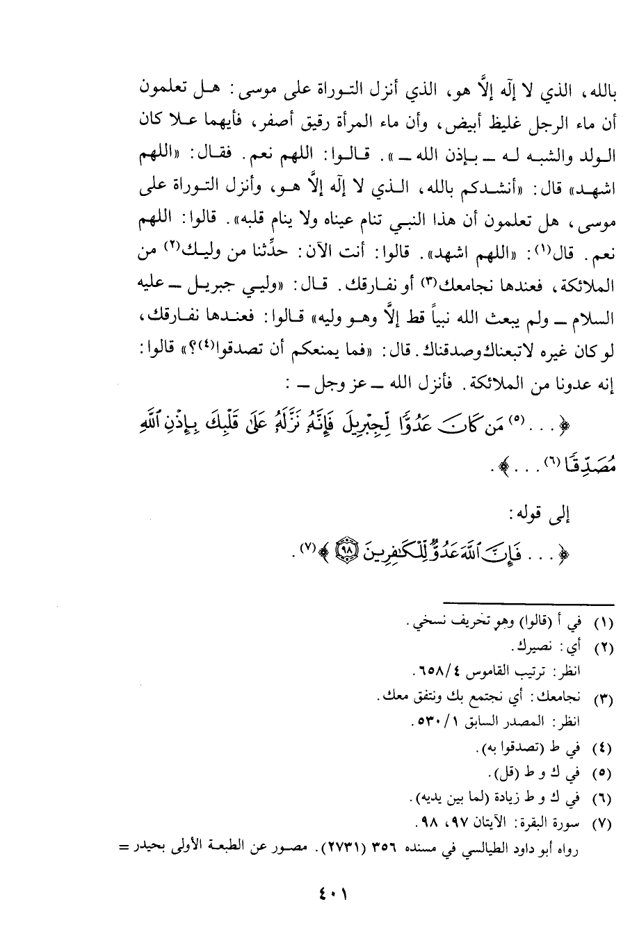 بِاللَّهِ الَّذِي لَا إِلَهَ إِلَّا هُوَ، الَّذِي أَنْزَلَ التَّوْرَاةَ عَلَى مُوسَى ; هَلْ تَعْلَمُونَ أَنَّ مَاءَ الرَّجُلِ غَلِيظٌ أَبْيَضُ، وَأَنَّ مَاءَ الْمَرْأَةِ رَقِيقٌ أَصْفَرُ فَأَيُّهُمَا عَلَا كَانَ الْوَلَدُ، وَالشَّبَهُ لَهُ بِإِذْنِ اللَّهِ، قَالُوا: اللَّهُمَّ نَعَمْ، فَقَالَ: اللَّهُمَّ اشْهَدْ، قَالَ: أَنْشُدُكُمْ بِاللَّهِ الَّذِي لَا إِلَهَ إِلَّا هُوَ، وَأَنْزَلَ التَّوْرَاةَ عَلَى مُوسَى ; هَلْ تَعْلَمُونَ أَنَّ هَذَا النَّبِيَّ تَنَامُ عَيْنَاهُ، وَلَا يَنَامُ قَلْبُهُ، قَالُوا: اللَّهُمَّ نَعَمْ، قَالَ: اللَّهُمَّ اشْهَدْ، قَالُوا: أَنْتَ الْآنَ حَدِّثْنَا مَنْ وَلِيُّكَ مِنَ الْمَلَائِكَةِ، فَعِنْدَهَا نُجَامِعُكَ أَوْ نُفَارِقُكَ، قَالَ: وَلِيِّي جِبْرِيلُ عَلَيْهِ السَّلَامُ، وَلَمْ يَبْعَثِ اللَّهُ نَبِيًّا قَطُّ إِلَّا وَهُو وَلِيُّهُ، قَالُوا: فَعِنْدَهَا نُفَارِقُكَ، لَوْ كَانَ غَيْرَهُ لَاتَّبَعْنَاكَ وَصَدَّقْنَاكَ، قَالَ: فَمَا يَمْنَعُكُمْ أَنْ تُصَدِّقُوا قَالُوا: إِنَّهُ عَدُّوُنَا مِنَ الْمَلَائِكَةِ. فَأَنْزَلَ اللَّهُ عَزَّ وَجَلَّ:
