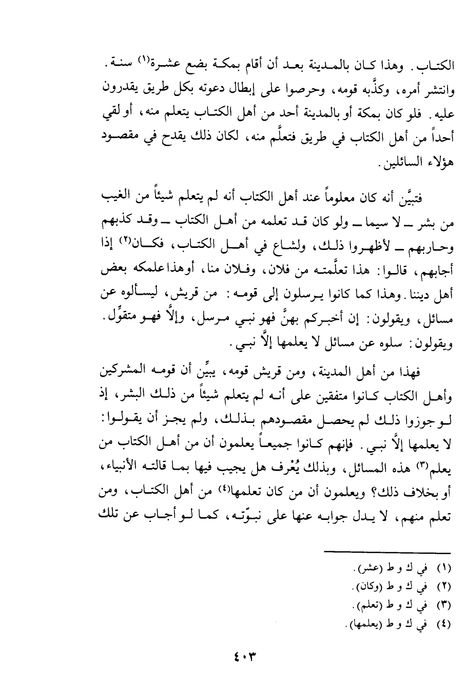 الْكِتَابِ. وَهَذَا كَانَ بِالْمَدِينَةِ بَعْدَ أَنْ أَقَامَ بِمَكَّةَ بِضْعَةَ عَشْرَةَ سَنَةً، وَانْتَشَرَ أَمْرُهُ، وَكَذَّبَهُ قَوْمُهُ، وَحَرَصُوا عَلَى إِبْطَالِ دَعْوَتِهِ بِكُلِّ طَرِيقٍ يَقْدِرُونَ عَلَيْهِ، فَلَوْ كَانَ بِمَكَّةَ أَوْ بِالْمَدِينَةِ أَحَدٌ مِنْ أَهْلِ الْكِتَابِ يَتَعَلَّمُ مِنْهُ، أَوْ لَقِيَ أَحَدًا مِنْ أَهْلِ الْكِتَابِ فِي طَرِيقٍ فَتَعَلَّمَ مِنْهُ، لَكَانَ ذَلِكَ يَقْدَحُ فِي مَقْصُودِ هَؤُلَاءِ السَّائِلِينَ.