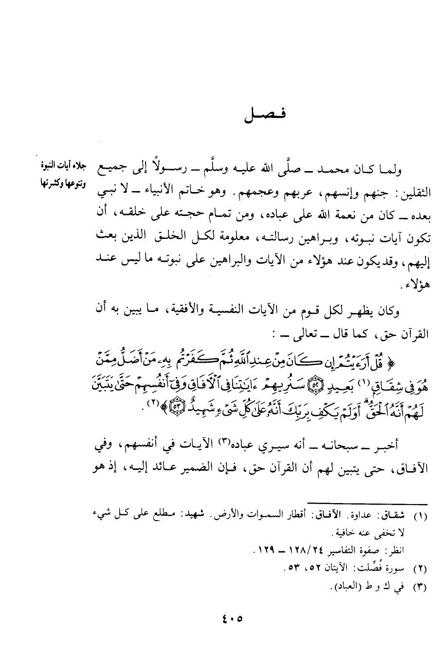 وَلَمَّا كَانَ مُحَمَّدٌ صَلَّى اللَّهُ عَلَيْهِ وَسَلَّمَ رَسُولًا إِلَى جَمِيعِ الثَّقَلَيْنِ جِنِّهِمْ وَإِنْسُهِمْ، عَرَبِهِمْ وَعَجَمِهِمْ، وَهُوَ خَاتَمُ الْأَنْبِيَاءِ - لَا نَبِيَّ بَعْدَهُ - كَانَ مِنْ نِعْمَةِ اللَّهِ عَلَى عِبَادِهِ، وَمِنْ تَمَامِ حُجَّتِهِ عَلَى خَلْقِهِ أَنْ تَكُونَ آيَاتُ نُبُوَّتِهِ وَبَرَاهِينُ رِسَالَتِهِ مَعْلُومَةً لِكُلِّ الْخَلْقِ الَّذِينَ بُعِثَ إِلَيْهِمْ، وَقَدْ يَكُونُ عِنْدَ هَؤُلَاءِ مِنَ الْآيَاتِ وَالْبَرَاهِينِ عَلَى نُبُوَّتِهِ، مَا لَيْسَ عِنْدَ هَؤُلَاءِ.