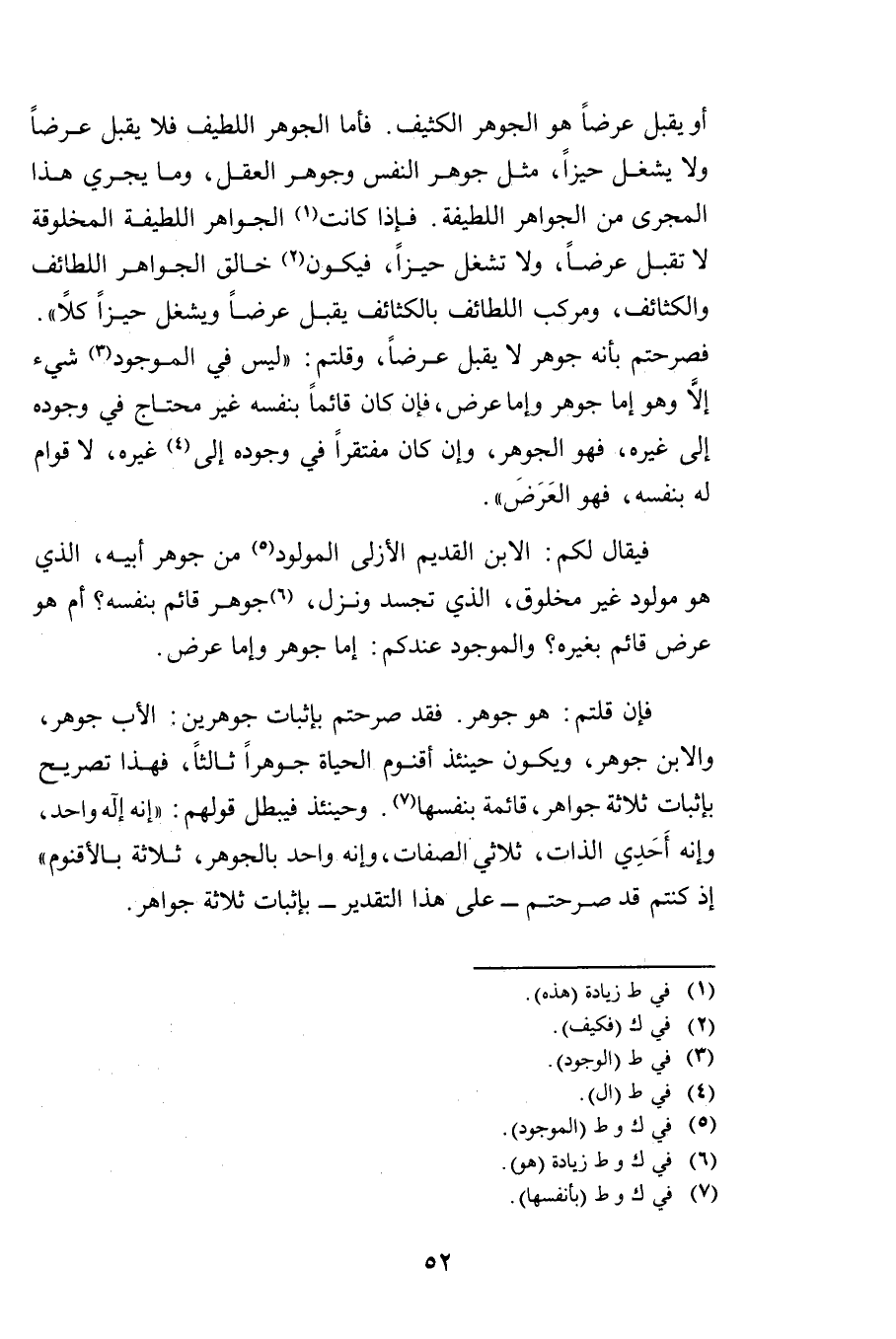 أَوْ يَقْبَلُ عَرَضًا هُوَ الْجَوْهَرُ الْكَثِيفُ؛ فَأَمَّا الْجَوْهَرُ اللَّطِيفُ فَلَا يَقْبَلُ عَرَضًا وَلَا يَشْغَلُ حَيِّزًا؛ مِثْلَ جَوْهَرِ النَّفْسِ وَجَوْهَرِ الْعَقْلِ، وَمَا يَجْرِي هَذَا الْمَجْرَى مِنَ الْجَوَاهِرِ اللَّطِيفَةِ. فَإِذَا كَانَتِ الْجَوَاهِرُ اللَّطِيفَةُ الْمَخْلُوقَةُ لَا تَقْبَلُ عَرَضًا وَلَا تَشْغَلُ حَيِّزًا؛ فَيَكُونُ خَالِقُ الْجَوَاهِرِ اللَّطَائِفِ وَالْكَثَائِفِ وَمُرَكِّبِ اللَّطَائِفِ بِالْكَثَائِفِ يَقْبَلُ عَرَضًا وَيَشْغَلُ حَيِّزًا كَلَّا " فَصَرَّحْتُمْ بِأَنَّهُ جَوْهَرٌ لَا يَقْبَلُ عَرَضًا، وَقُلْتُمْ: " لَيْسَ فِي الْمَوْجُودِ شَيْءٌ إِلَّا وَهُوَ إِمَّا جَوْهَرٌ وَإِمَّا عَرَضٌ؛ فَإِنْ كَانَ قَائِمًا بِنَفْسِهِ غَيْرَ مُحْتَاجٍ فِي وُجُودِهِ إِلَى غَيْرِهِ فَهُوَ الْجَوْهَرُ، وَإِنْ كَانَ مُفْتَقِرًا فِي وُجُودِهِ إِلَى غَيْرِهِ لَا قِوَامَ لَهُ بِنَفْسِهِ فَهُوَ الْعَرَضُ ".