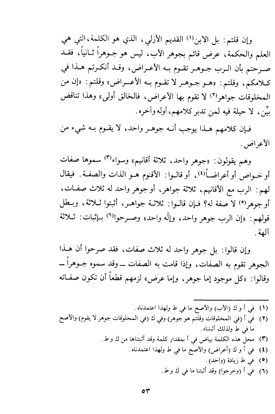 وَإِنْ قُلْتُمْ: بَلِ الِابْنُ الْقَدِيمُ الْأَزَلِيُّ، الَّذِي هُوَ الْكَلِمَةُ، الَّتِي هِيَ الْعِلْمُ وَالْحِكْمَةُ، عَرَضٌ قَائِمٌ بِجَوْهَرِ الْأَبِ، لَيْسَ هُوَ جَوْهَرًا ثَانِيًا؛ فَقَدْ صَرَّحْتُمْ بِأَنَّ الرَّبَّ جَوْهَرٌ تَقُومُ بِهِ الْأَعْرَاضُ، وَقَدْ أَنْكَرْتُمْ هَذَا فِي كَلَامِكُمْ، وَقُلْتُمْ: " هُوَ جَوْهَرٌ لَا تَقُومُ بِهِ الْأَعْرَاضُ " وَقُلْتُمْ: " إِنَّ مِنَ الْمَخْلُوقَاتِ جَوَاهِرَ لَا تَقُومُ بِهَا الْأَعْرَاضُ، فَالْخَالِقُ أَوْلَى " وَهَذَا تَنَاقُضٌ بَيِّنٌ لَا حِيلَةَ فِيهِ لِمَنْ تَدَبَّرَ كَلَامَهُمْ أَوَّلَهُ وَآخِرَهُ.