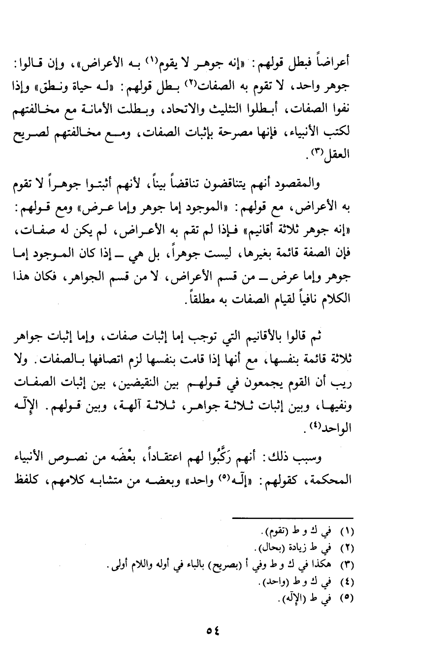 ثُمَّ قَالُوا بِالْأَقَانِيمِ الَّتِي تُوجِبُ إِمَّا إِثْبَاتَ صِفَاتٍ، وَإِمَّا إِثْبَاتَ جَوَاهِرَ ثَلَاثَةٍ قَائِمَةٍ بِنَفْسِهَا، مَعَ أَنَّهَا إِذَا قَامَتْ بِنَفْسِهَا لَزِمَ اتِّصَافُهَا بِالصِّفَاتِ. وَلَا رَيْبَ أَنَّ الْقَوْمَ يَجْمَعُونَ فِي قَوْلِهِمْ بَيْنَ النَّقِيضَيْنِ، بَيْنَ إِثْبَاتِ الصِّفَاتِ وَنَفْيِهَا، وَبَيْنَ إِثْبَاتِ ثَلَاثَةِ جَوَاهِرَ ثَلَاثَةِ آلِهَةٍ، وَبَيْنَ قَوْلِهِمُ الْإِلَهُ الْوَاحِدُ.