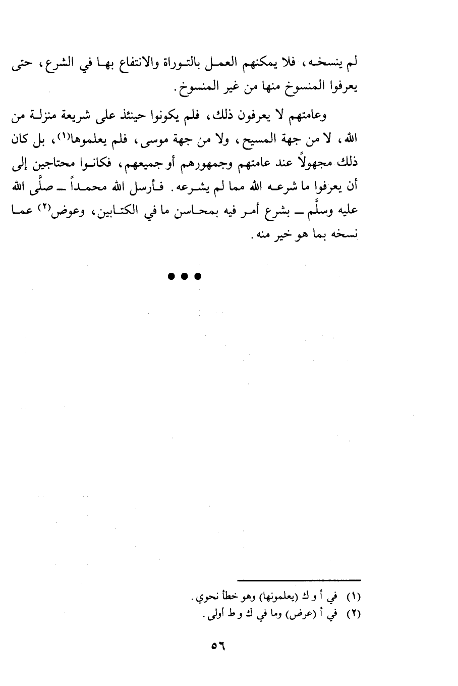 وَعَامَّتُهُمْ لَا يَعْرِفُونَ ذَلِكَ، فَلَمْ يَكُونُوا حِينَئِذٍ عَلَى شَرِيعَةٍ مُنَزَّلَةٍ مِنَ اللَّهِ، لَا مِنْ جِهَةِ الْمَسِيحِ، وَلَا مِنْ جِهَةِ مُوسَى فَلَمْ يَعْلَمُوهَا، بَلْ كَانَ ذَلِكَ مَجْهُولًا عِنْدَ عَامَّتِهِمْ وَجُمْهُورِهِمْ أَوْ جَمِيعِهِمْ، فَكَانُوا مُحْتَاجِينَ إِلَى أَنْ يَعْرِفُوا مَا شَرَعَهُ اللَّهُ مِمَّا لَمْ يَشْرَعْهُ؛ فَأَرْسَلَ اللَّهُ مُحَمَّدًا - صَلَّى اللَّهُ عَلَيْهِ وَسَلَّمَ - بِشَرْعٍ أَمَرَ فِيهِ بِمَحَاسِنِ مَا فِي الْكِتَابَيْنِ، وَعِوَضٍ عَمَّا نَسَخَهُ بِمَا هُوَ خَيْرٌ مِنْهُ.