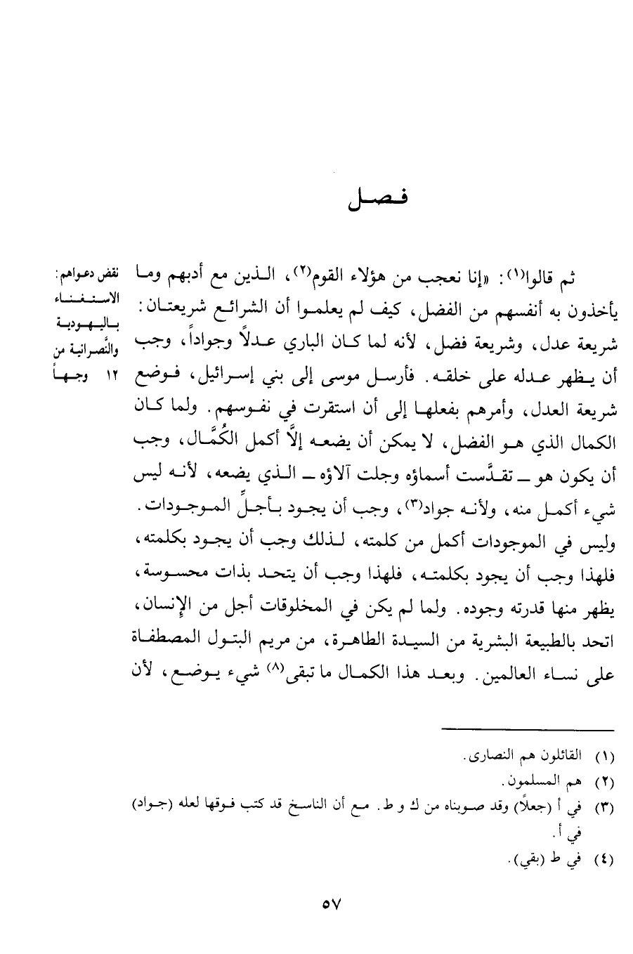 ثُمَّ قَالُوا: " إِنَّا نَعْجَبُ مِنْ هَؤُلَاءِ الْقَوْمِ، الَّذِينَ مَعَ أَدَبِهِمْ وَمَا يَأْخُذُونَ بِهِ أَنْفُسَهُمْ مِنَ الْفَضْلِ، كَيْفَ لَمْ يَعْلَمُوا أَنَّ الشَّرَائِعَ شَرِيعَتَانِ: شَرِيعَةُ عَدْلٍ وَشَرِيعَةُ فَضْلٍ؛ لِأَنَّهُ لَمَّا كَانَ الْبَارِي عَدْلًا وَجَوَّادًا وَجَبَ أَنْ يُظْهِرَ عَدْلَهُ عَلَى خَلْقِهِ فَأَرْسَلَ مُوسَى إِلَى بَنِي إِسْرَائِيلَ فَوَضَعَ شَرِيعَةَ الْعَدْلِ وَأَمَرَهُمْ بِفِعْلِهَا إِلَى أَنِ اسْتَقَرَّتْ فِي نُفُوسِهِمْ، وَلَمَّا كَانَ الْكَمَالُ الَّذِي هُوَ الْفَضْلُ لَا يُمْكِنُ أَنْ يَضَعَهُ إِلَّا أَكْمَلُ الْكُمَّالِ، وَجَبَ أَنْ يَكُونَ هُوَ - تَقَدَّسَتْ أَسْمَاؤُهُ وَجَلَّتْ آلَاؤُهُ - الَّذِي يَضَعُهُ؛ لِأَنَّهُ لَيْسَ شَيْءٌ أَكْمَلَ مِنْهُ، وَلِأَنَّهُ جَوَّادٌ؛ وَجَبَ أَنْ يَجُودَ بِأَجَلِّ الْمَوْجُودَاتِ وَلَيْسَ فِي الْمَوْجُودَاتِ أَكْمَلُ مِنْ كَلِمَتِهِ؛ لِذَلِكَ وَجَبَ أَنْ يَجُودَ بِكَلِمَتِهِ، فَلِهَذَا وَجَبَ أَنْ يَجُودَ بِكَلِمَتِهِ، فَلِهَذَا وَجَبَ أَنْ يَتَّحِدَ بِذَاتٍ مَحْسُوسَةٍ يُظْهِرُ مِنْهَا قُدْرَتَهُ وَجُودَهُ. وَلَمَّا لَمْ يَكُنْ فِي الْمَخْلُوقَاتِ أَجَلُّ مِنَ الْإِنْسَانِ، اتَّحَدَ بِالطَّبِيعَةِ الْبَشَرِيَّةِ مِنَ السَّيِّدَةِ الطَّاهِرَةِ، مِنْ مَرْيَمَ الْبَتُولِ الْمُصْطَفَاةِ عَلَى نِسَاءِ الْعَالَمِينَ، وَبَعْدَ هَذَا الْكَمَالِ مَا تَبَقَّى شَيْءٌ يُوضَعُ؛ لِأَنَّ