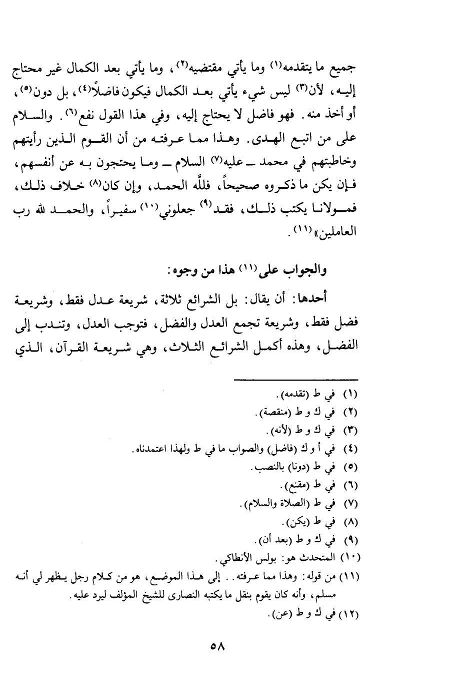 جَمِيعَ مَا يَتَقَدَّمُهُ وَمَا يَأْتِي مُقْتَضِيهِ، وَمَا يَأْتِي بَعْدَ الْكَمَالِ غَيْرُ مُحْتَاجٍ إِلَيْهِ؛ لِأَنَّ لَيْسَ شَيْءٌ يَأْتِي بَعْدَ الْكَمَالِ فَيَكُونُ فَاضِلًا، بَلْ دُونَ، أَوْ أَخَذَ مِنْهُ. فَهُوَ فَاضِلٌ لَا يَحْتَاجُ إِلَيْهِ، وَفِي هَذَا الْقَوْلِ نَفْعٌ. وَالسَّلَامُ عَلَى مَنِ اتَّبَعَ الْهُدَى، وَهَذَا مِمَّا عَرَفْتُهُ مِنْ أَنَّ الْقَوْمَ الَّذِينَ رَأَيْتُهُمْ وَخَاطَبْتُهُمْ فِي مُحَمَّدٍ - عَلَيْهِ السَّلَامُ - وَمَا يَحْتَجُّونَ بِهِ عَنْ أَنْفُسِهِمْ، فَإِنْ يَكُنْ مَا ذَكَرُوهُ صَحِيحًا؛ فَلِلَّهِ الْحَمْدُ. وَإِنْ كَانَ خِلَافَ ذَلِكَ فَمَوْلَانَا يَكْتُبُ ذَلِكَ، فَقَدْ جَعَلُونِي سَفِيرًا، وَالْحَمْدُ لِلَّهِ رَبِّ الْعَالَمِينَ ".