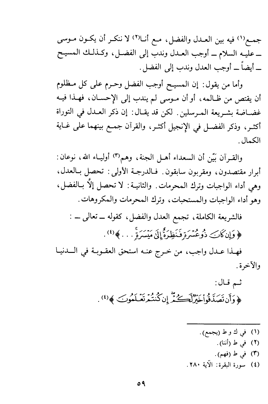 جُمِعَ فِيهِ بَيْنَ الْعَدْلِ وَالْفَضْلِ. مَعَ أَنَّا لَا نُنْكِرُ أَنْ يَكُونَ مُوسَى - عَلَيْهِ السَّلَامُ - أَوْجَبَ الْعَدْلَ وَنَدَبَ إِلَى الْفَضْلِ، وَكَذَلِكَ الْمَسِيحُ - أَيْضًا - أَوْجَبَ الْعَدْلَ وَنَدَبَ إِلَى الْفَضْلِ.