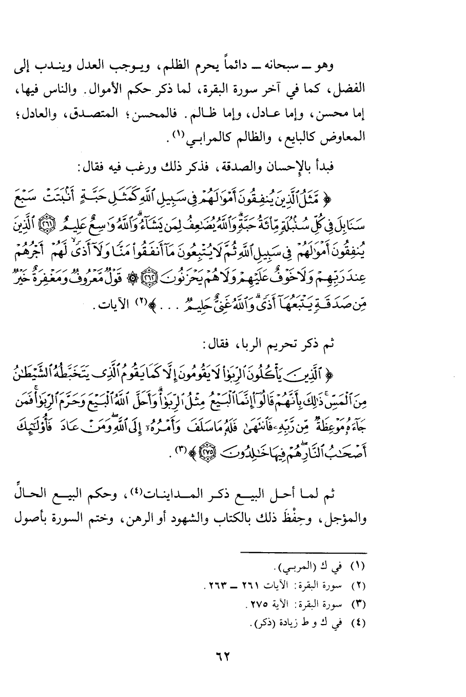وَهُوَ - سُبْحَانَهُ - دَائِمًا يُحَرِّمُ الظُّلْمَ وَيُوجِبُ الْعَدْلَ وَيَنْدُبُ إِلَى الْفَضْلِ، كَمَا فِي آخِرِ سُورَةِ الْبَقَرَةِ لَمَّا ذَكَرَ حُكْمَ الْأَمْوَالِ. وَالنَّاسُ فِيهَا إِمَّا مُحْسِنٌ وَإِمَّا عَادِلٌ وَإِمَّا ظَالِمٌ؛ فَالْمُحْسِنُ الْمُتَصَدِّقُ، وَالْعَادِلُ الْمُعَاوِضُ كَالْبَايِعِ، وَالظَّالِمُ كَالْمُرَابِي.
