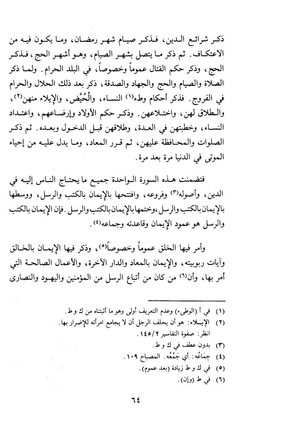 فَتَضَمَّنَتْ هَذِهِ السُّورَةُ الْوَاحِدَةُ جَمِيعَ مَا يَحْتَاجُ النَّاسُ إِلَيْهِ فِي الدِّينِ وَأُصُولِهِ وَفُرُوعِهِ، وَافْتَتَحَهَا بِالْإِيمَانِ بِالْكُتُبِ وَالرُّسُلِ، وَوَسَّطَهَا بِالْإِيمَانِ بِالْكُتُبِ وَالرُّسُلِ، وَخَتَمَهَا بِالْإِيمَانِ بِالْكُتُبِ وَالرُّسُلِ. فَإِنَّ الْإِيمَانَ بِالْكُتُبِ وَالرُّسُلِ هُوَ عَمُودُ الْإِيمَانِ وَقَاعِدَتُهُ وَجِمَاعُهُ.