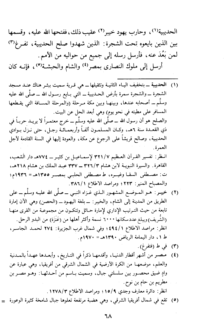 الْحُدَيْبِيَةِ، وَحَارَبَ يَهُودَ خَيْبَرَ عَقِيبَ ذَلِكَ، فَفَتَحَهَا اللَّهُ عَلَيْهِ، وَقَسَّمَهَا بَيْنَ الَّذِينَ بَايَعُوهُ تَحْتَ الشَّجَرَةِ: الَّذِينَ شَهِدُوا صُلْحَ الْحُدَيْبِيَةِ، تَفَرَّغَ لِمَنْ بَعُدَ عَنْهُ، فَأَرْسَلَ رُسُلَهُ إِلَى جَمِيعِ مَنْ حَوَالَيْهِ مِنَ الْأُمَمِ.